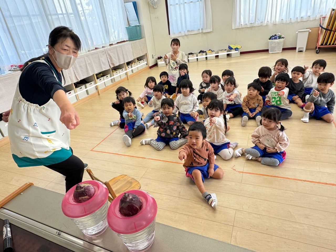 ヒアシンスの栽培☆ Bコースのお花は何色が咲くかな? みんなでお名前をつけて観察することに 「おはなちゃん」「きゅうくん」と命名しました。 「大きくなあれ」のおまじないも!