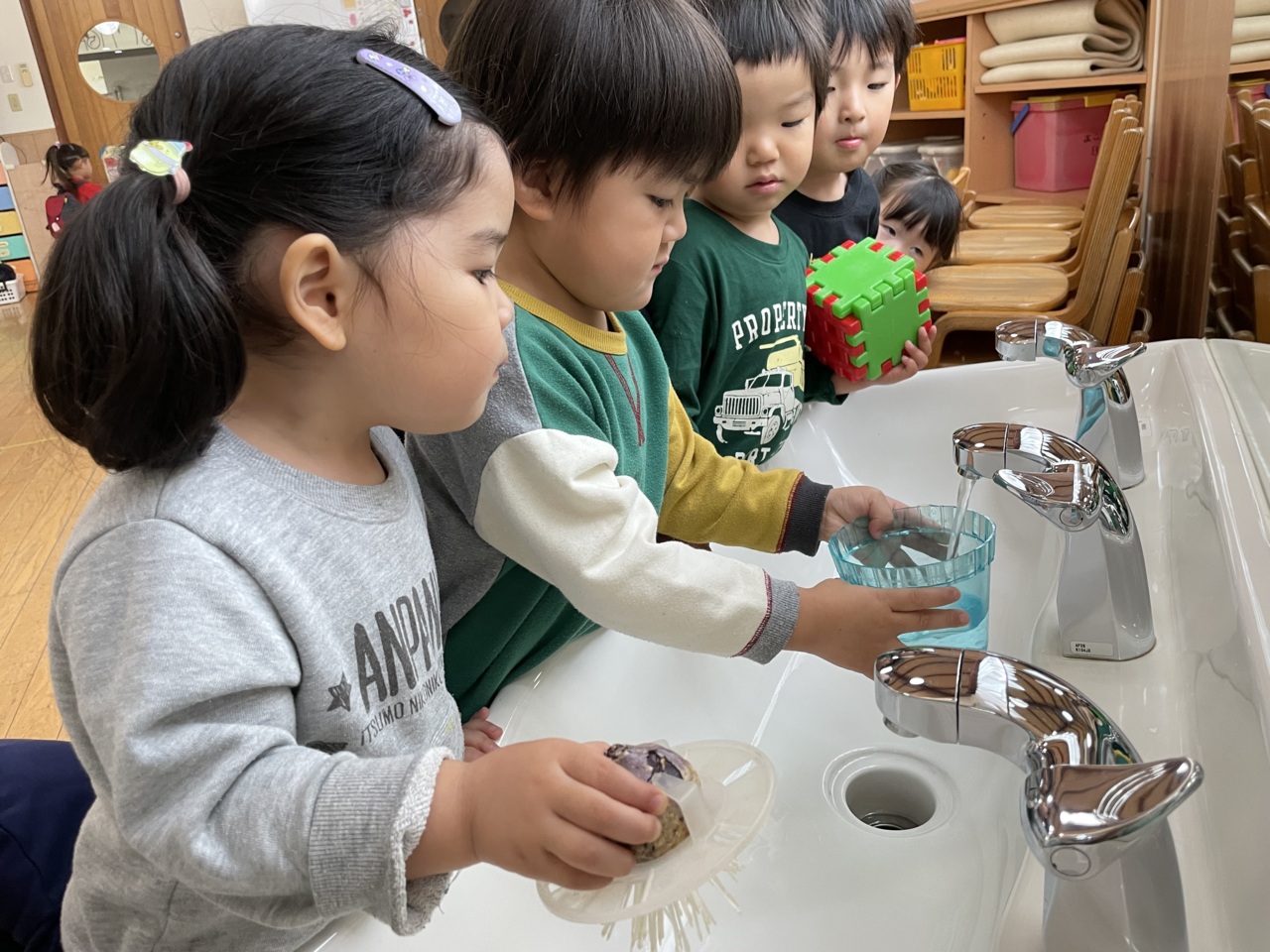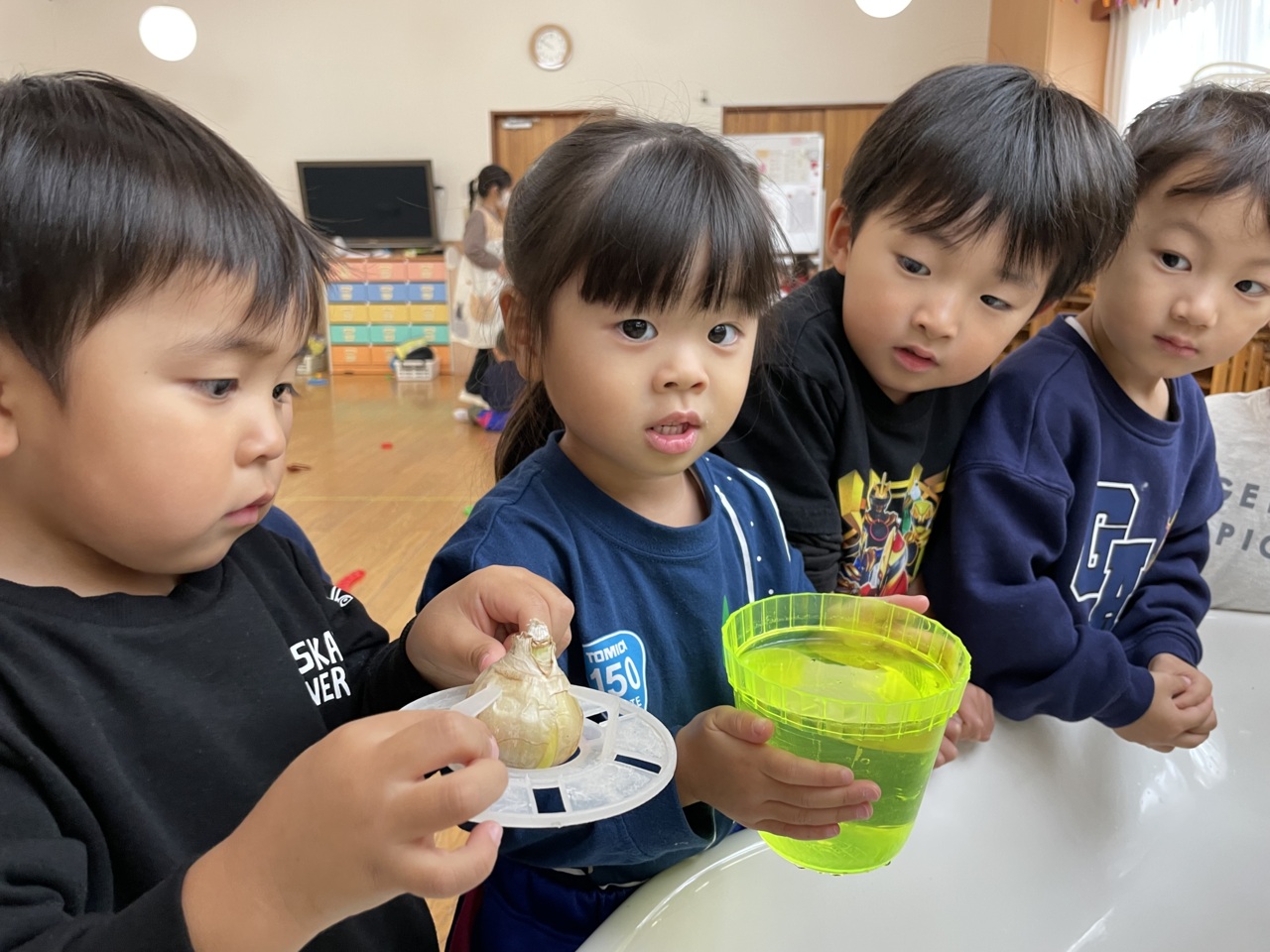 優しく球根を持って水につけます。早く花が咲かないかなと生長を楽しみにしている子どもたちです。