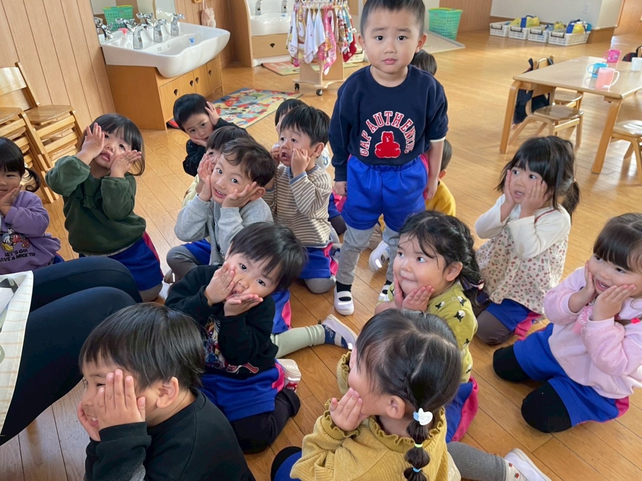 宇宙人が出てくる手遊びをしました!最後におもしろい宇宙人のお顔~!!と言ってこのポーズ☆みんなかわいいです( ´ ▽ ` )