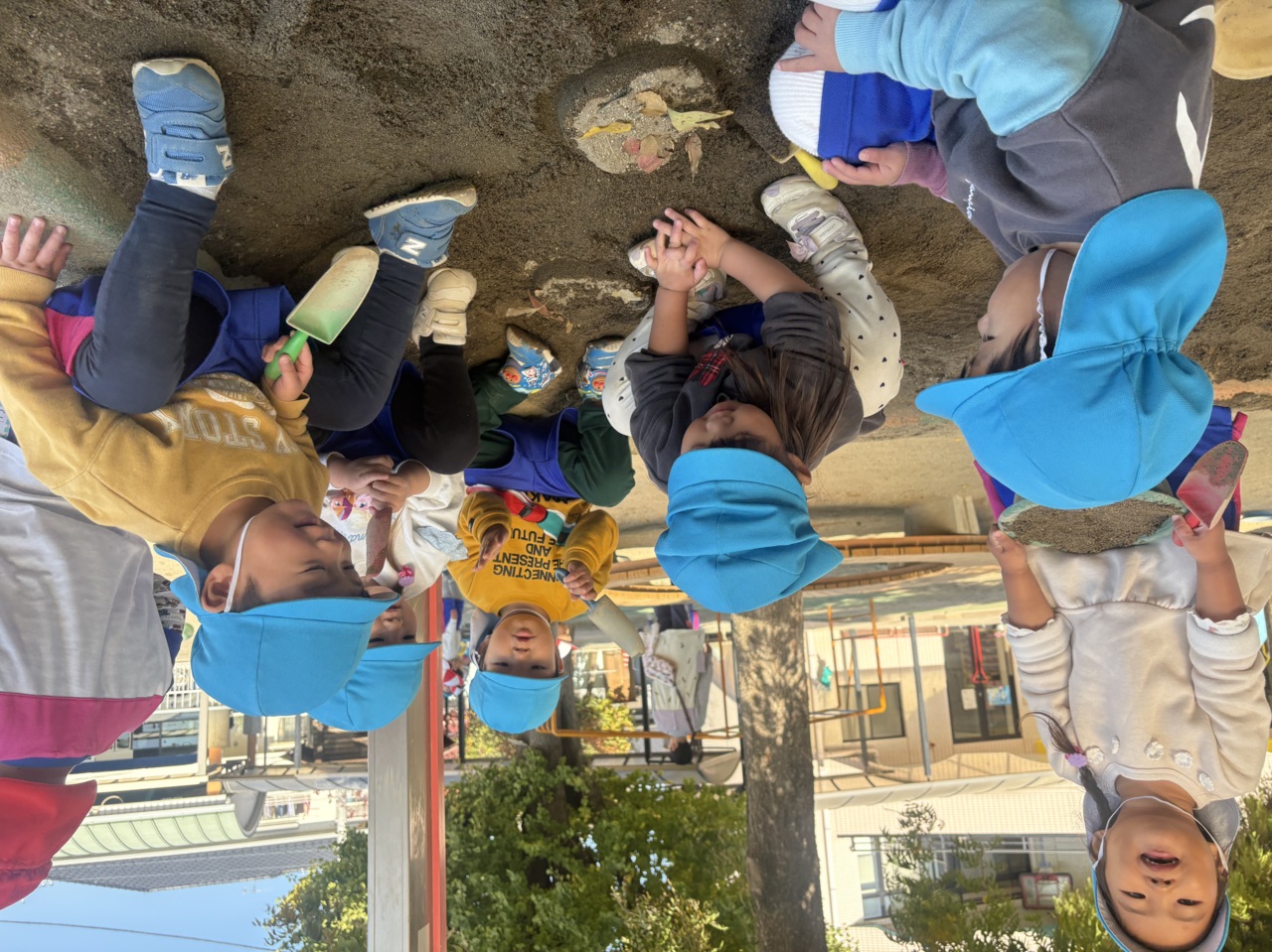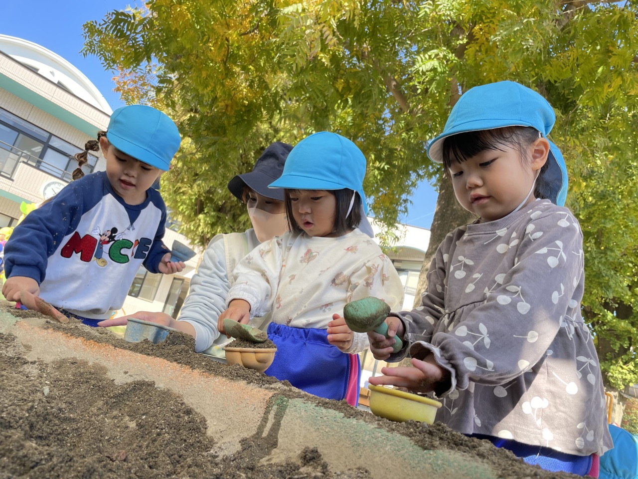 砂場でみんなでケーキ作りです。葉っぱでデコレーションかな?