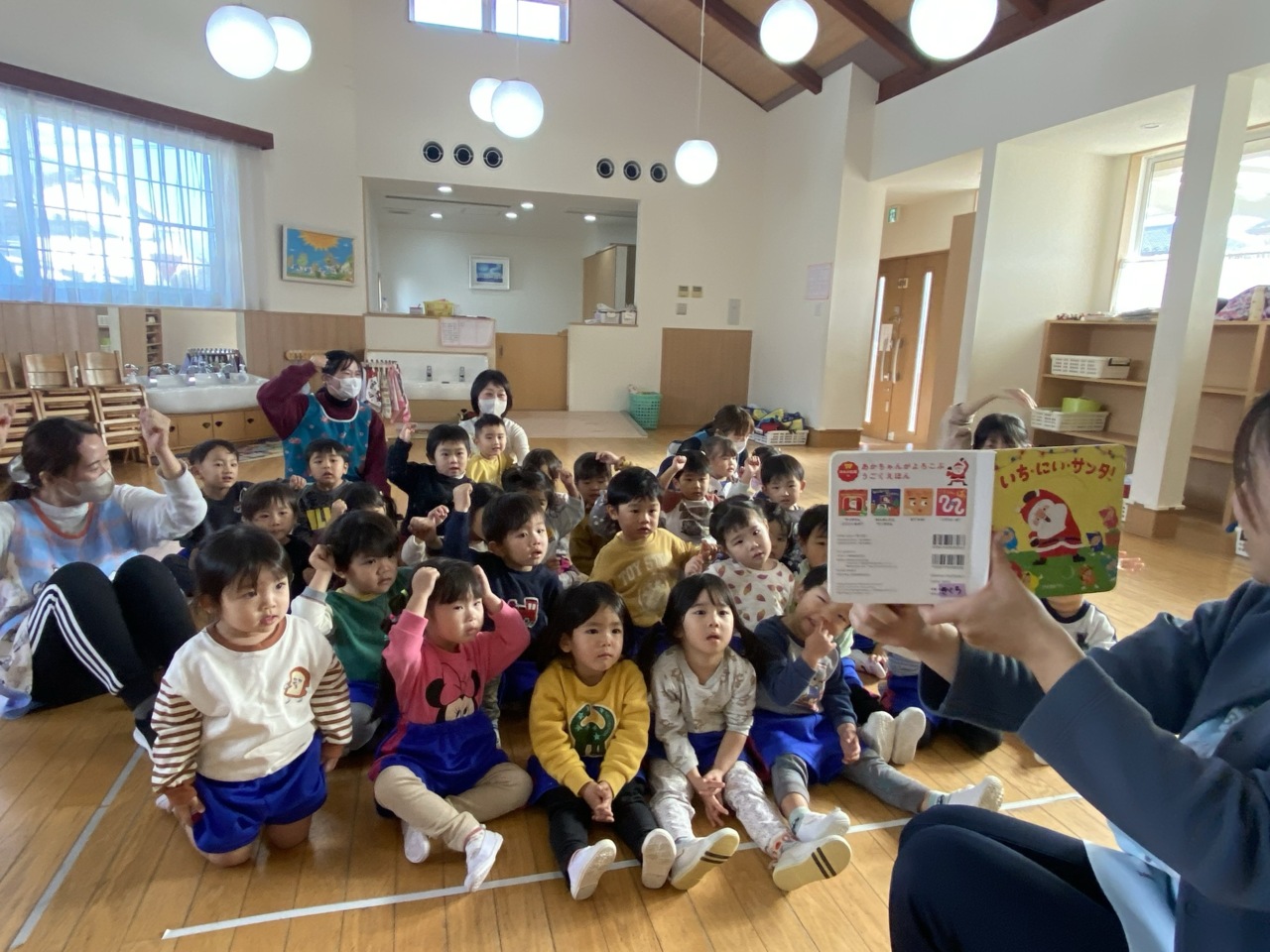 体操するサンタさんの絵本にみんな釘付けです! まねっこしてくれるお友だちもいました!