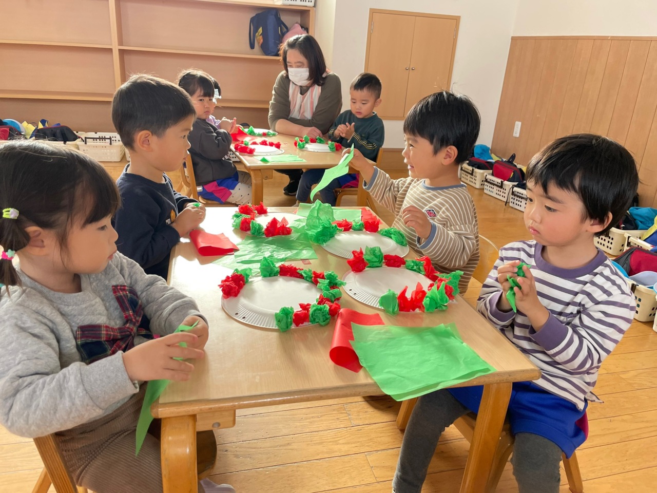 続いて赤と緑のお花紙でリース作りです。 薄くて柔らかいお花紙の感触を楽しみながら製作を進めました。