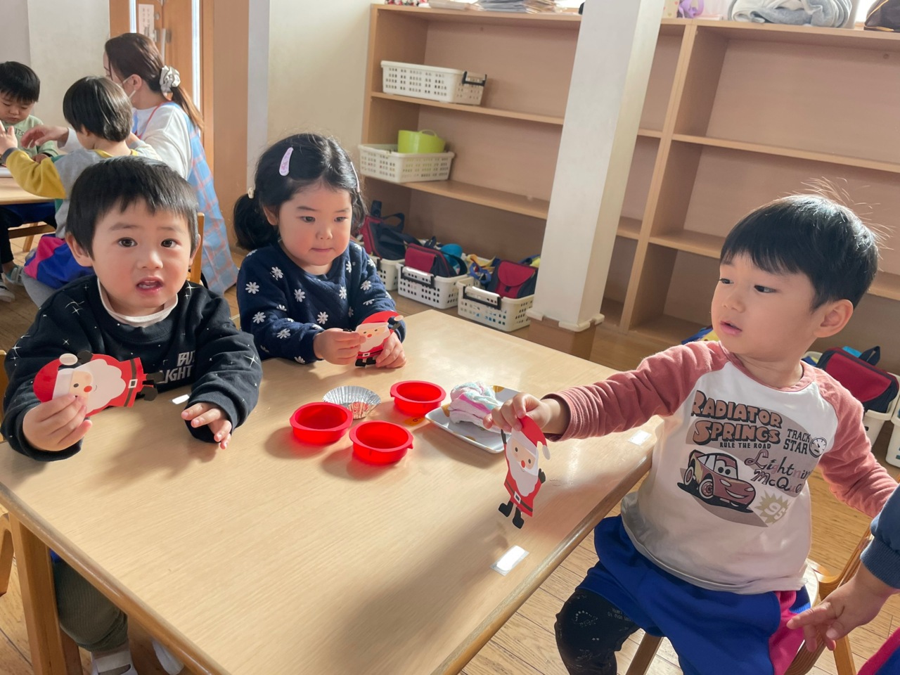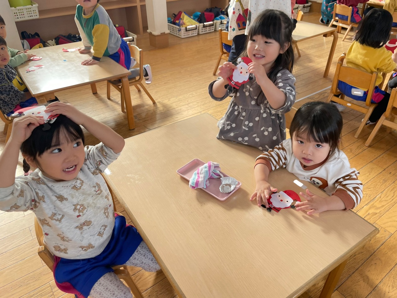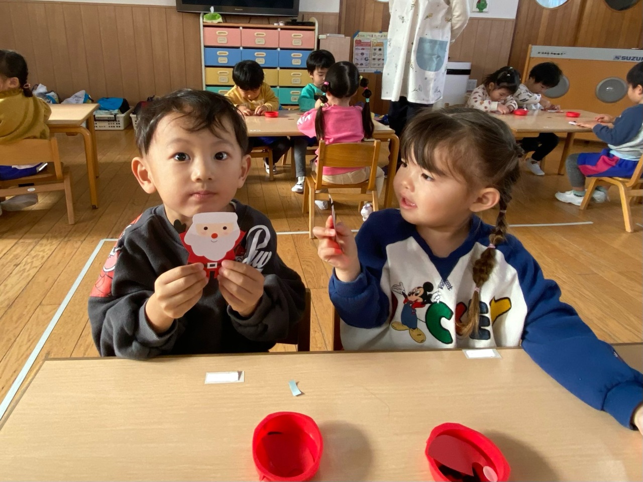次は、サンタさんを作ります。小さな目のシールでしたが、上手に貼れました。