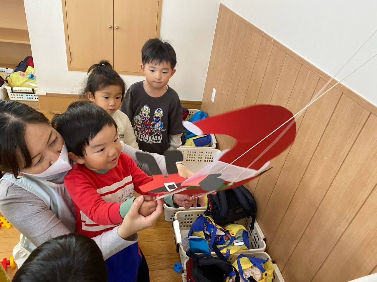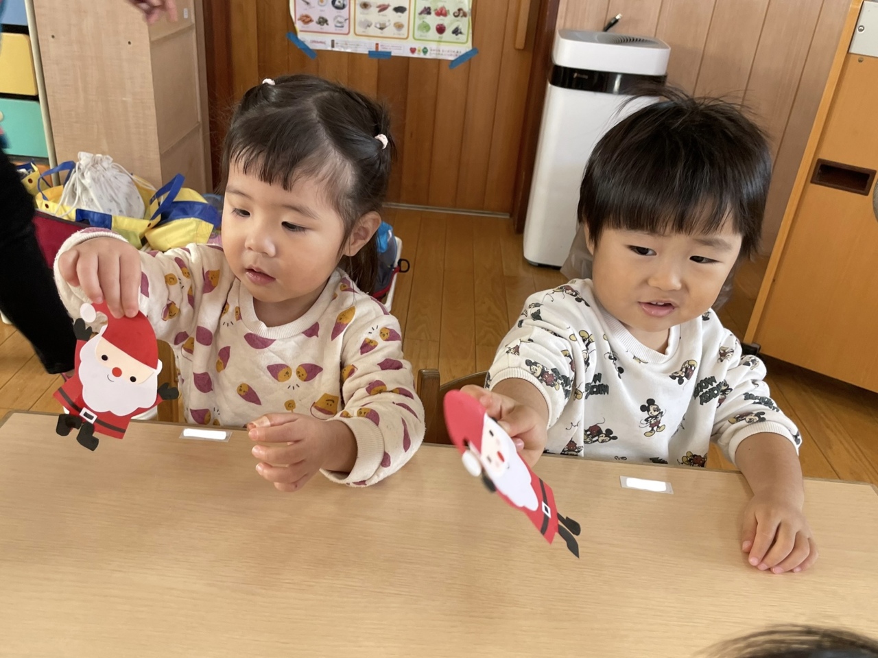 ビックサンタさんも登場です! ついているヒモを順に引っ張るとサンタさんが上に登っていきます。 お友だちと順番に挑戦です!