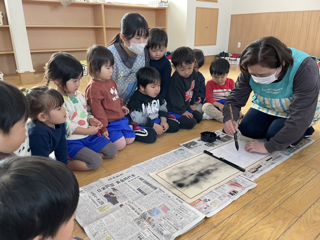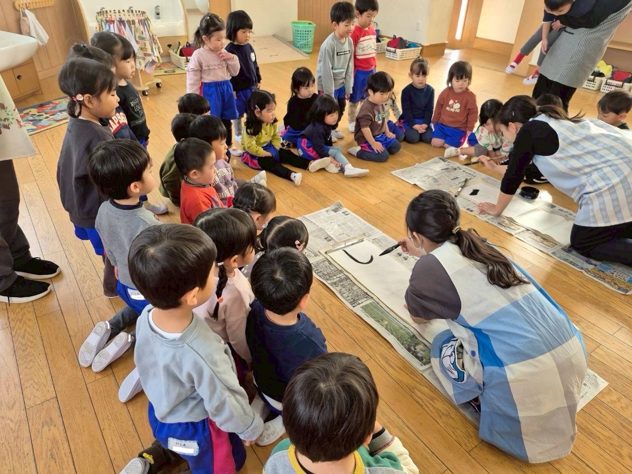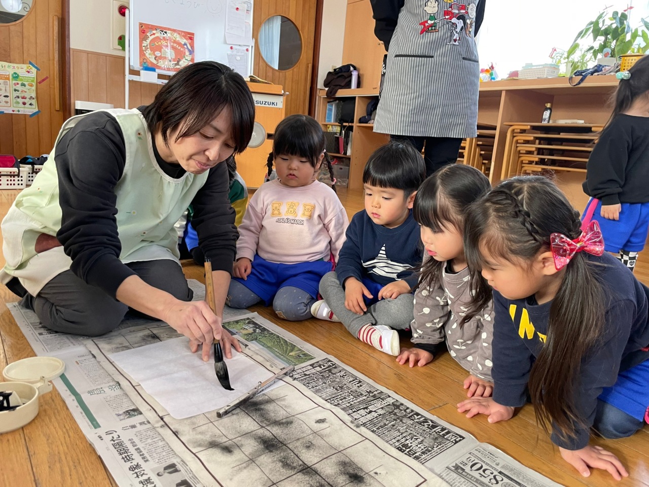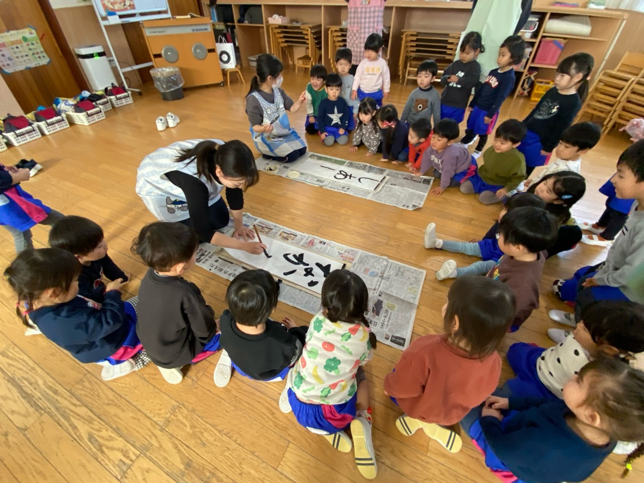 今回は、みんなで書き初めごっこをしてみることに! まずは、担任から…
