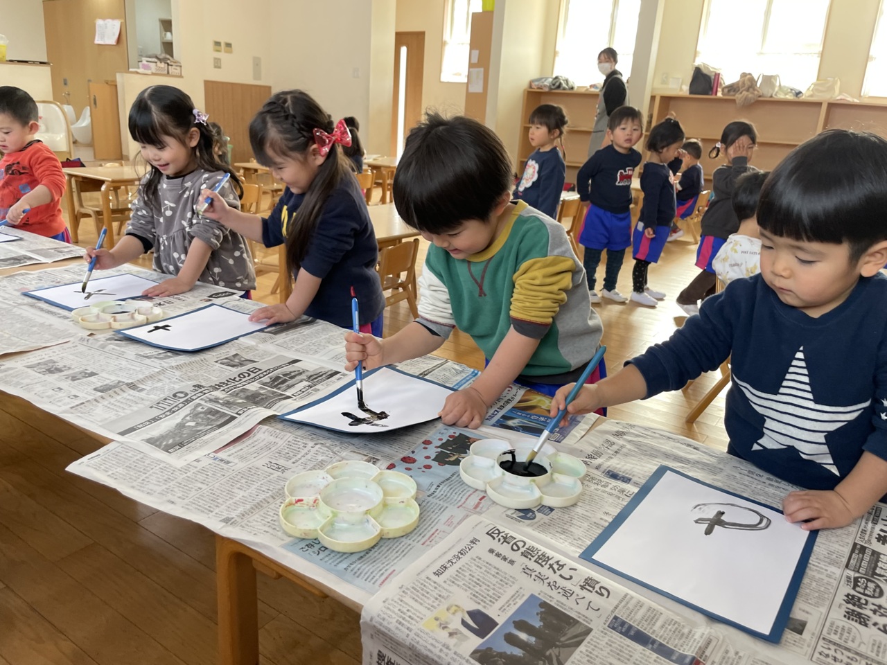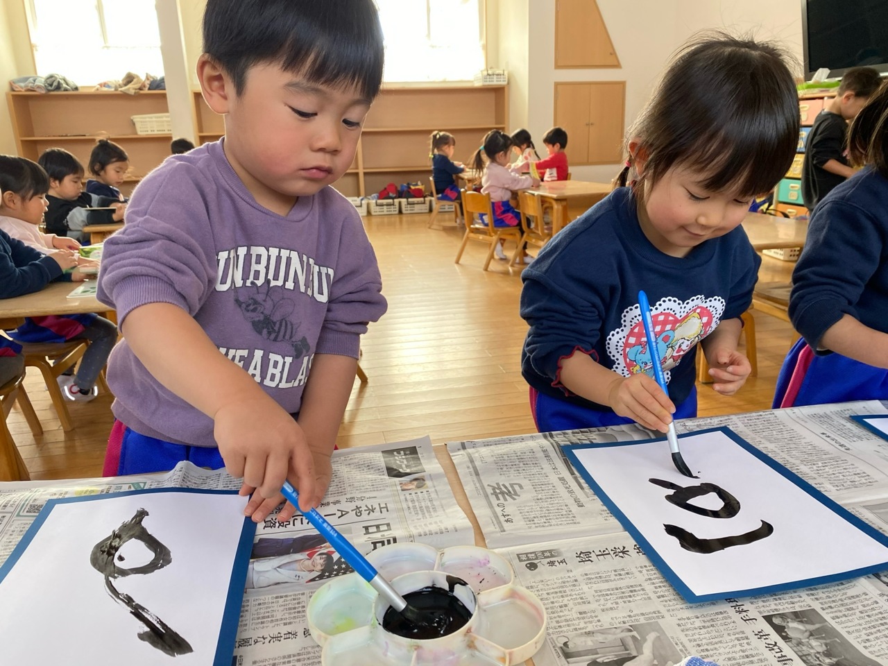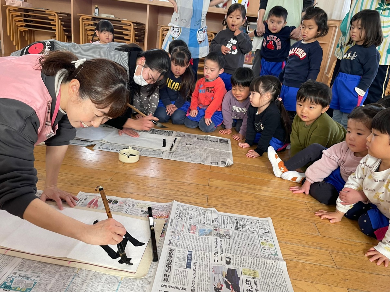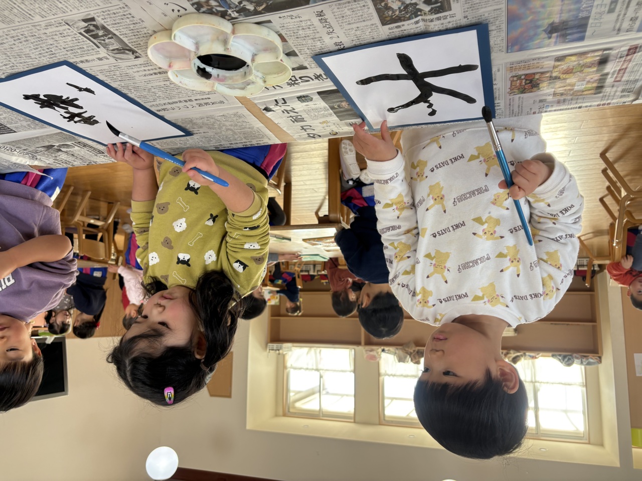 今回は、みんなで書き初めごっこをしてみることに! まずは、担任から…