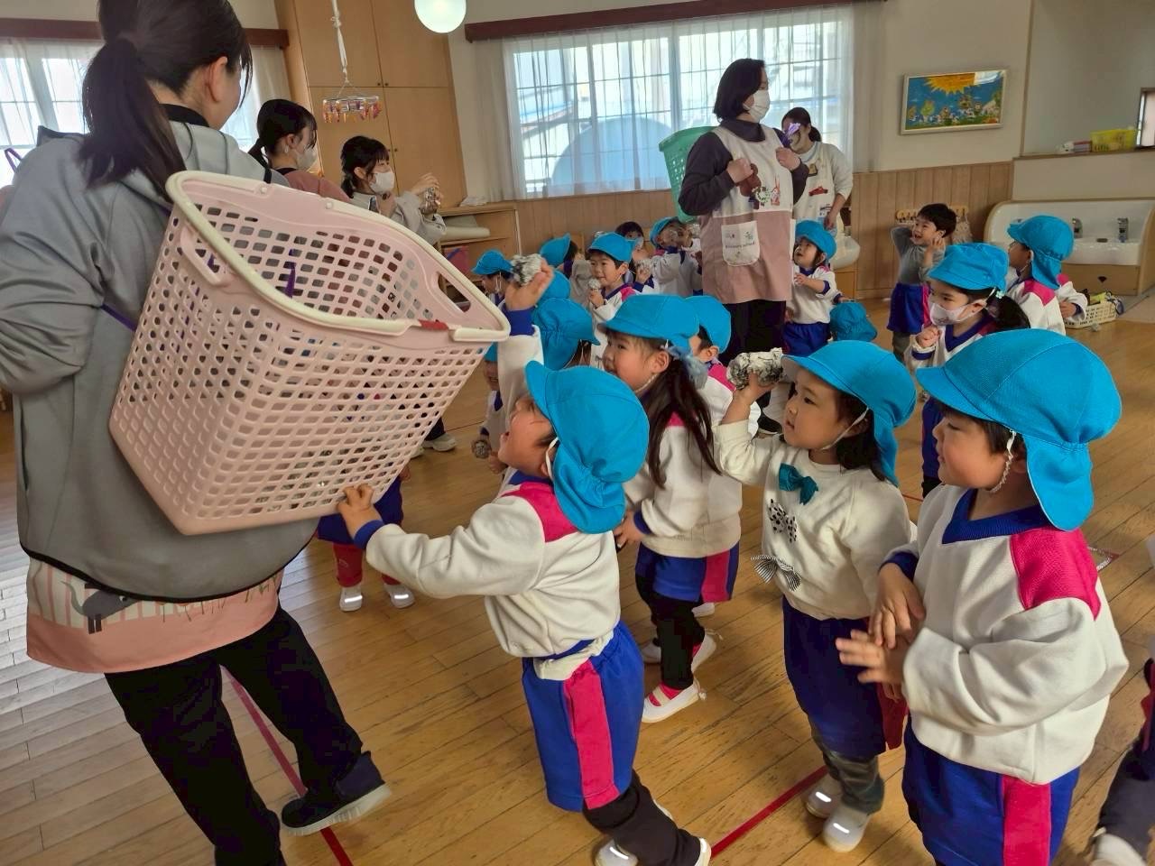 豆まき大会用に作った新聞豆で、玉入れ大会をしました! 動くかごに上手に入れられるかな!?