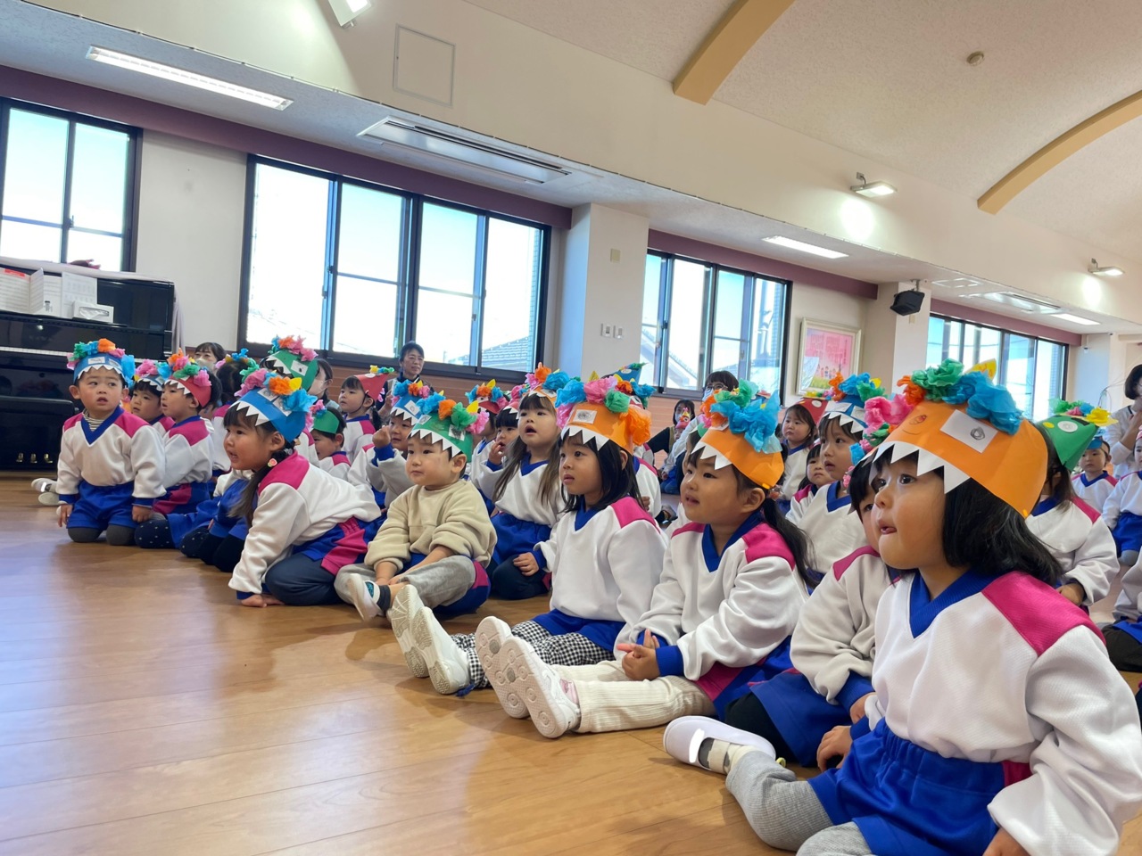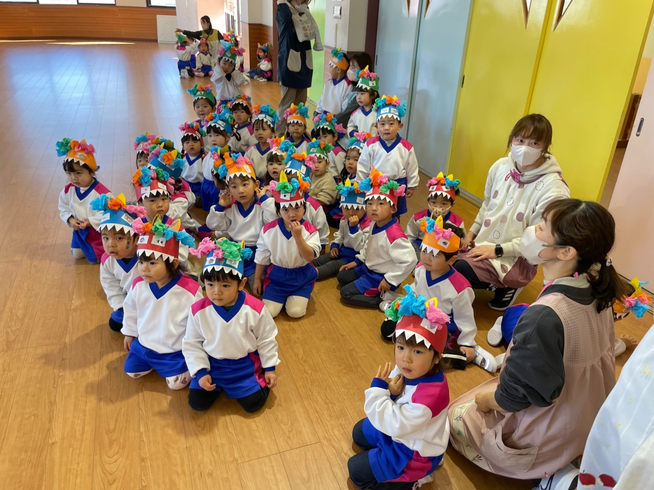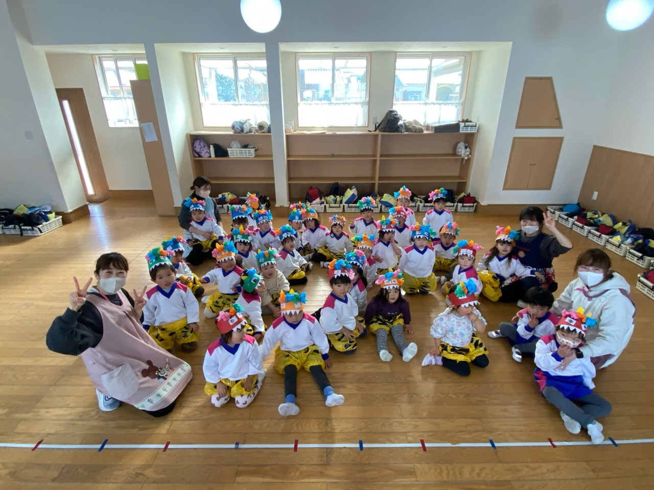 節分当日☆ お遊戯室にAコースさん、Bコースさん、そら組さん、みどり組さんが集合して豆まき大会を行いました!