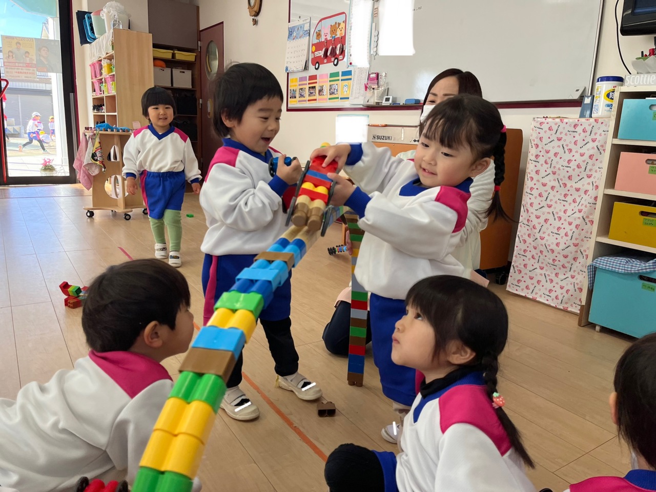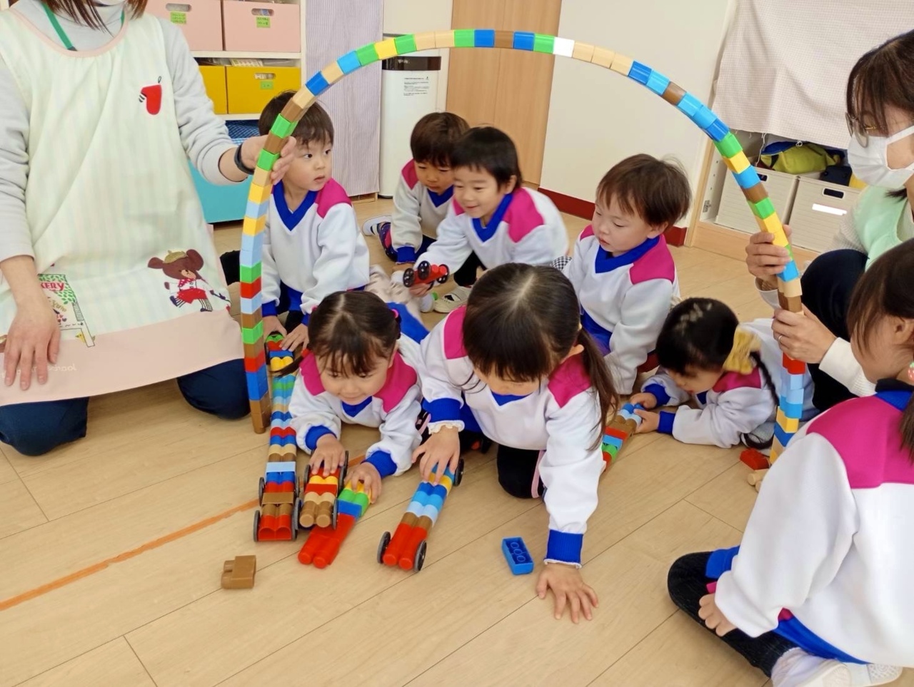 朝の室内遊び☆ Bブロックを長ーくつなげて、道路が出来ました! 「坂道~( ´ ▽ ` )」