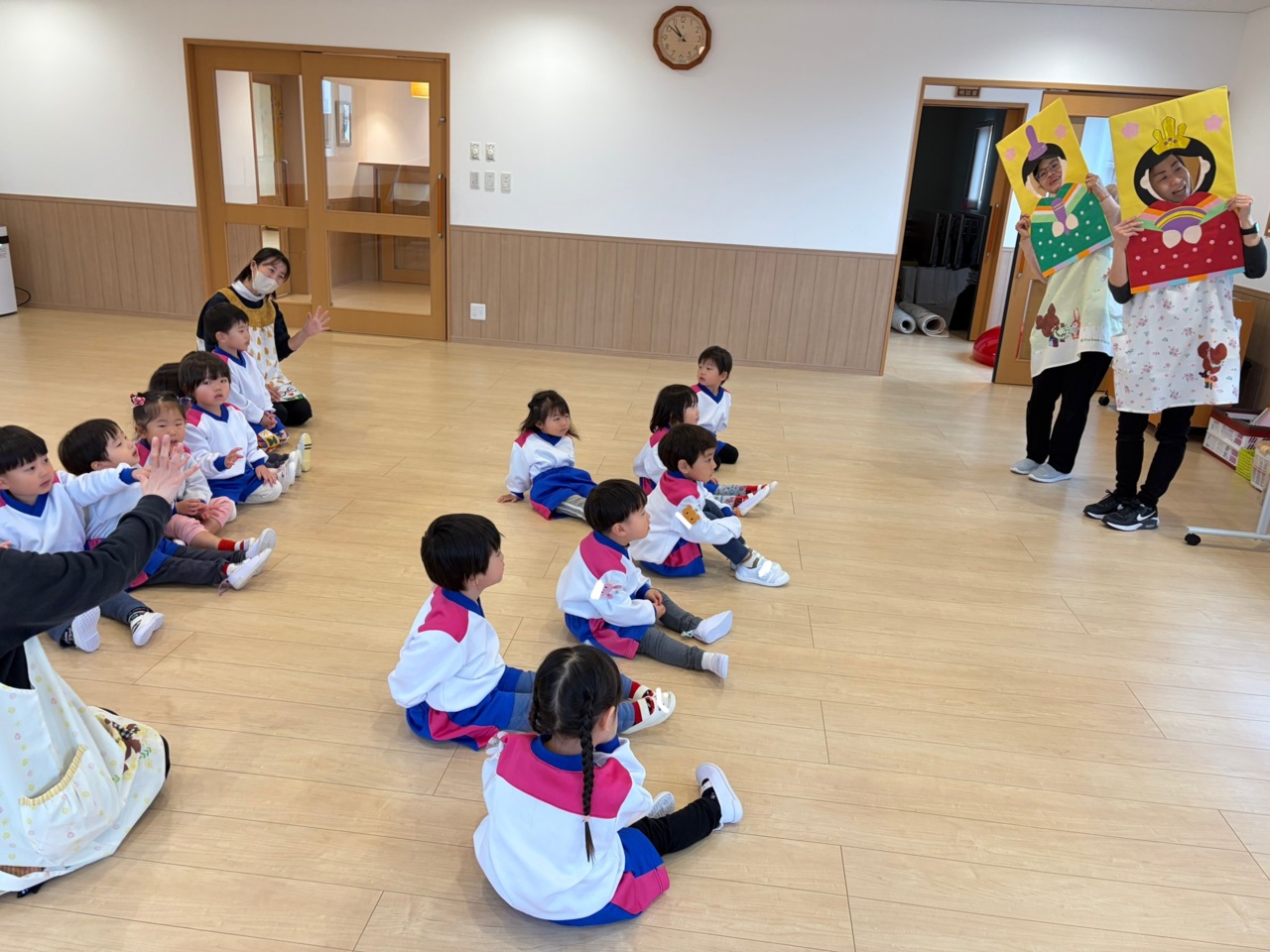 スペシャルゲストがたくさん! お内裏様とお雛様&保育園の2歳のお友達が来てくれました☆ 「お内裏様が手に持っているものは何?」と色々質問したり、一緒にお歌を歌ったりしました!