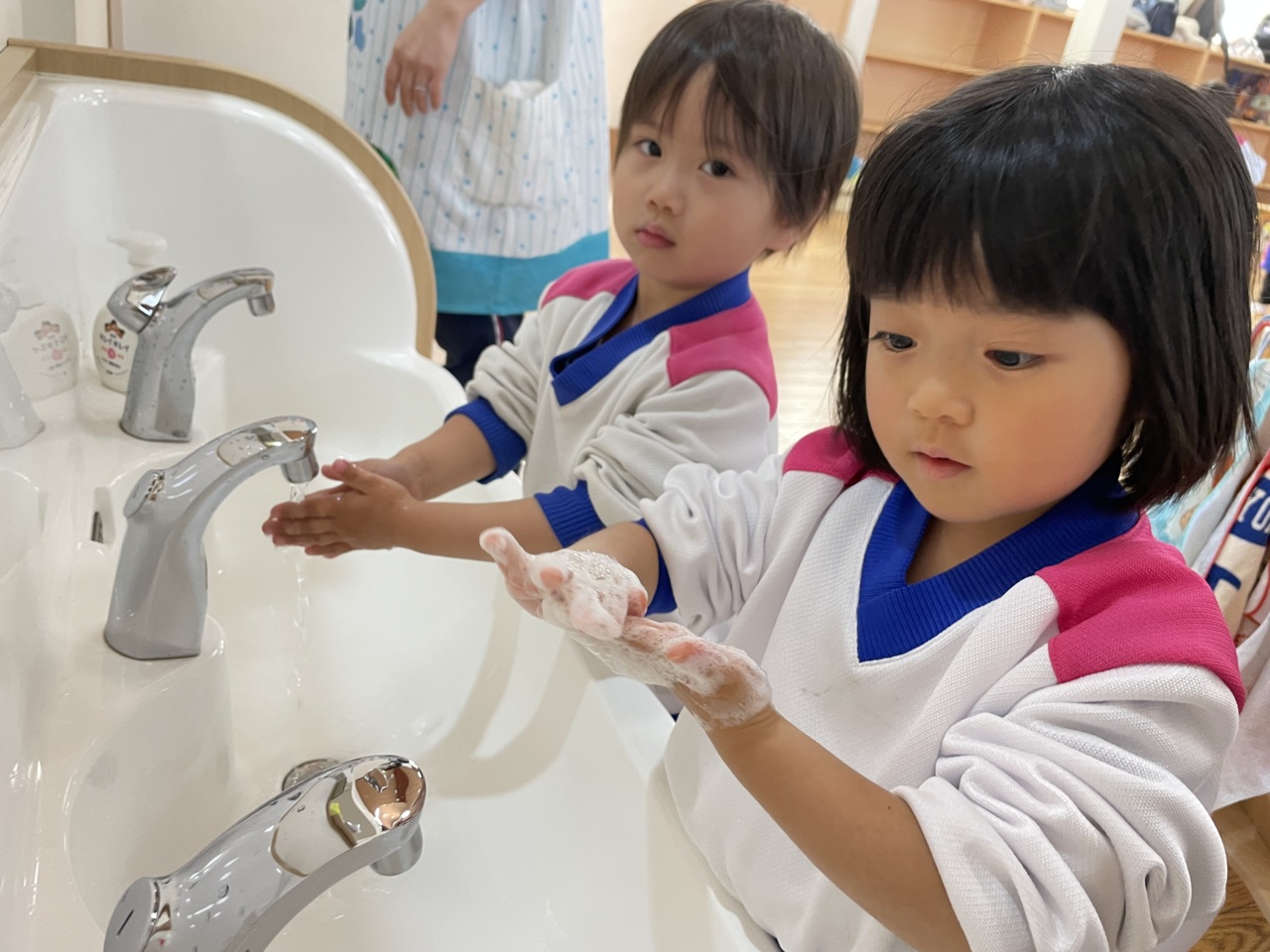 遊んだ後は、せっけんできれいに手を洗います!