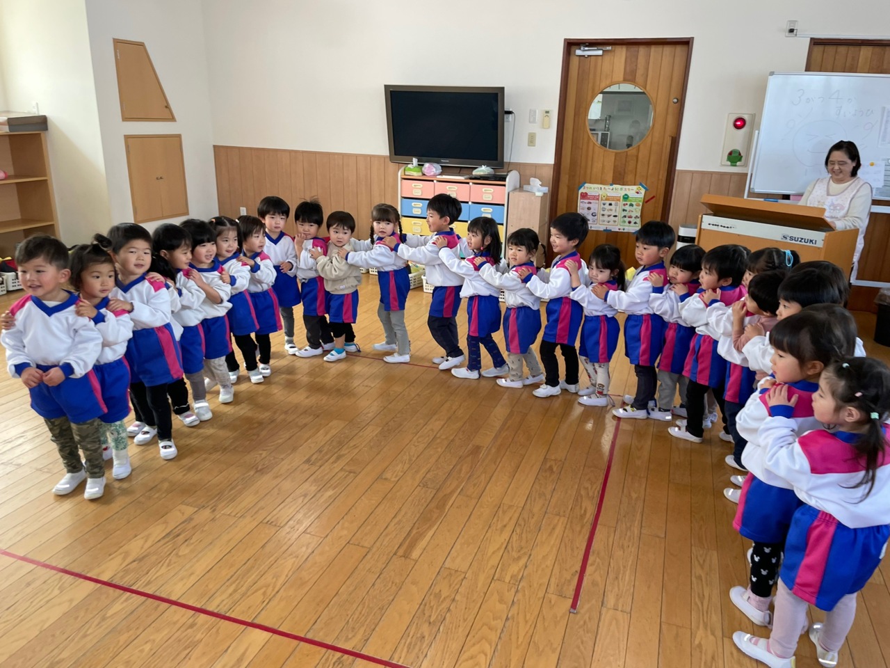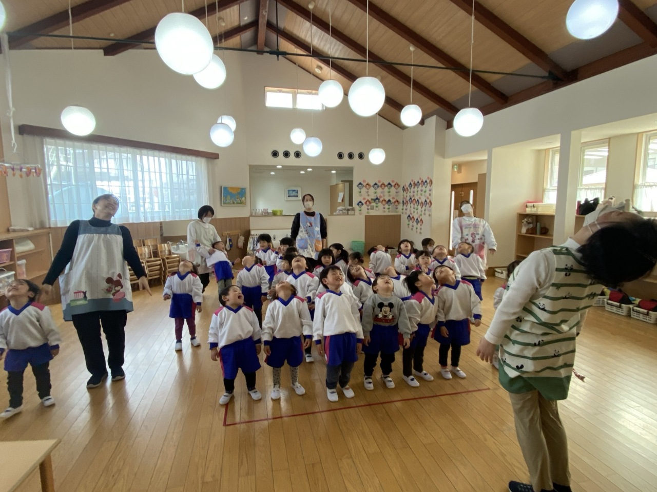 にじさんみんなで丸くなって、朝の会をしました。