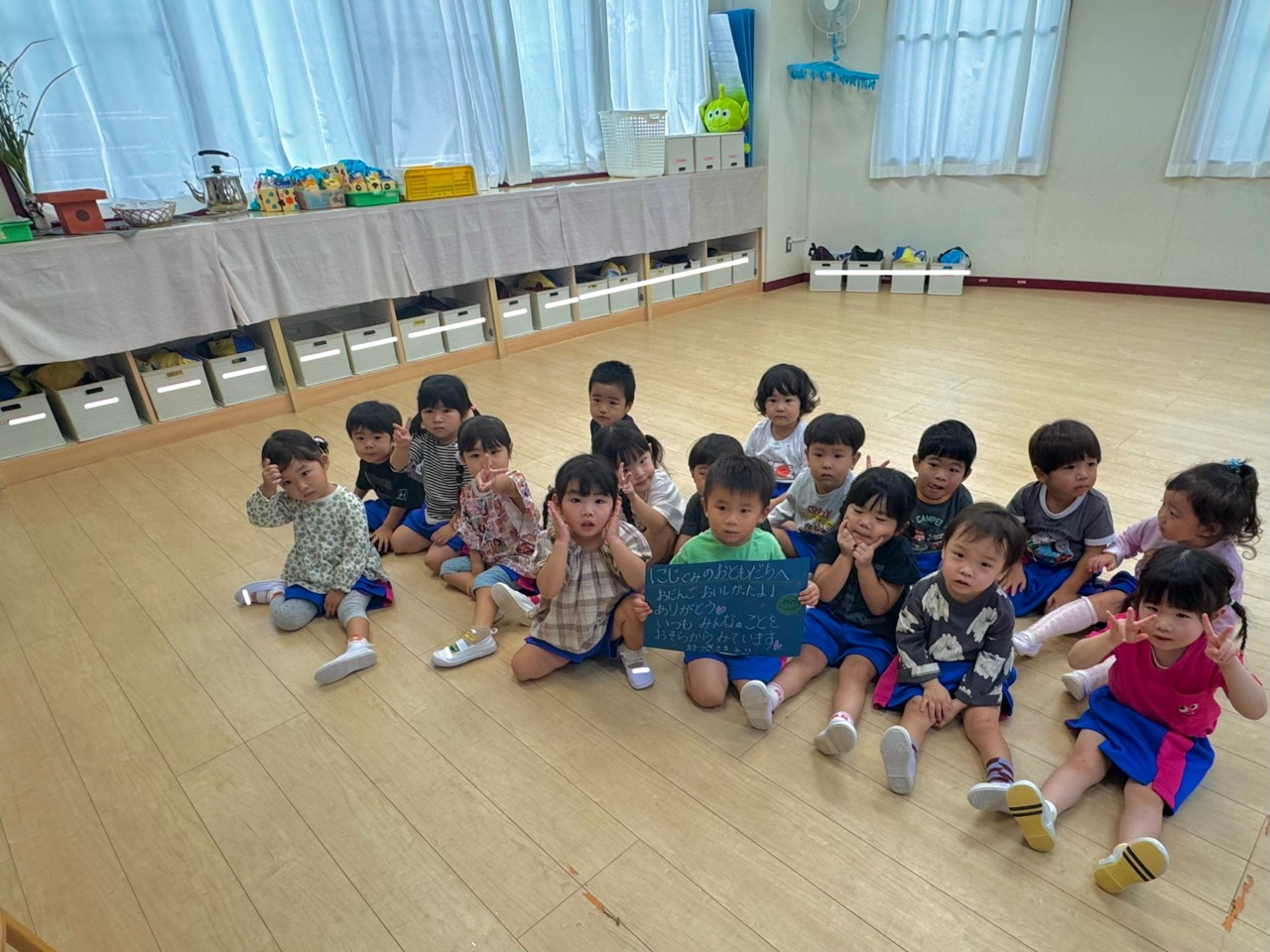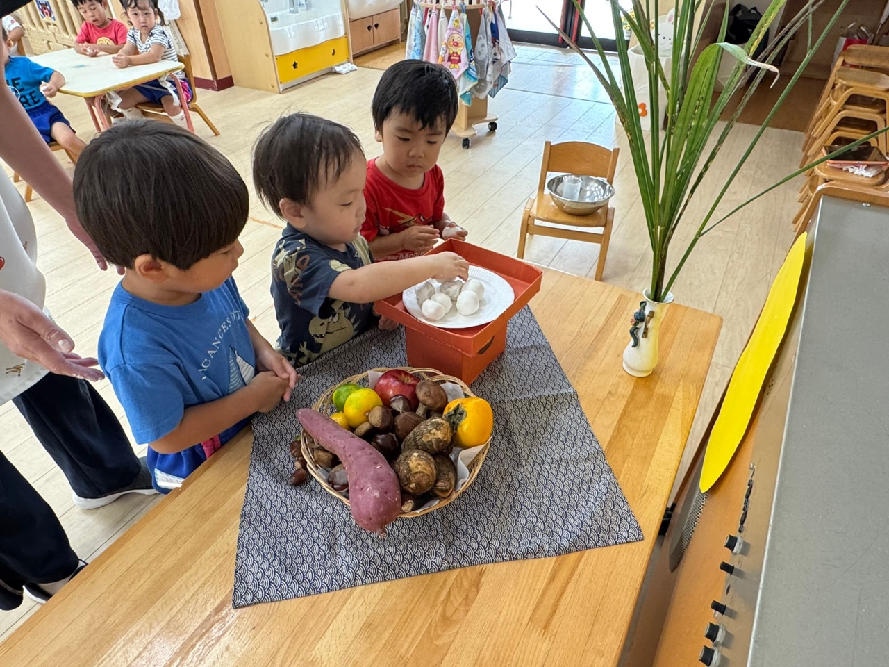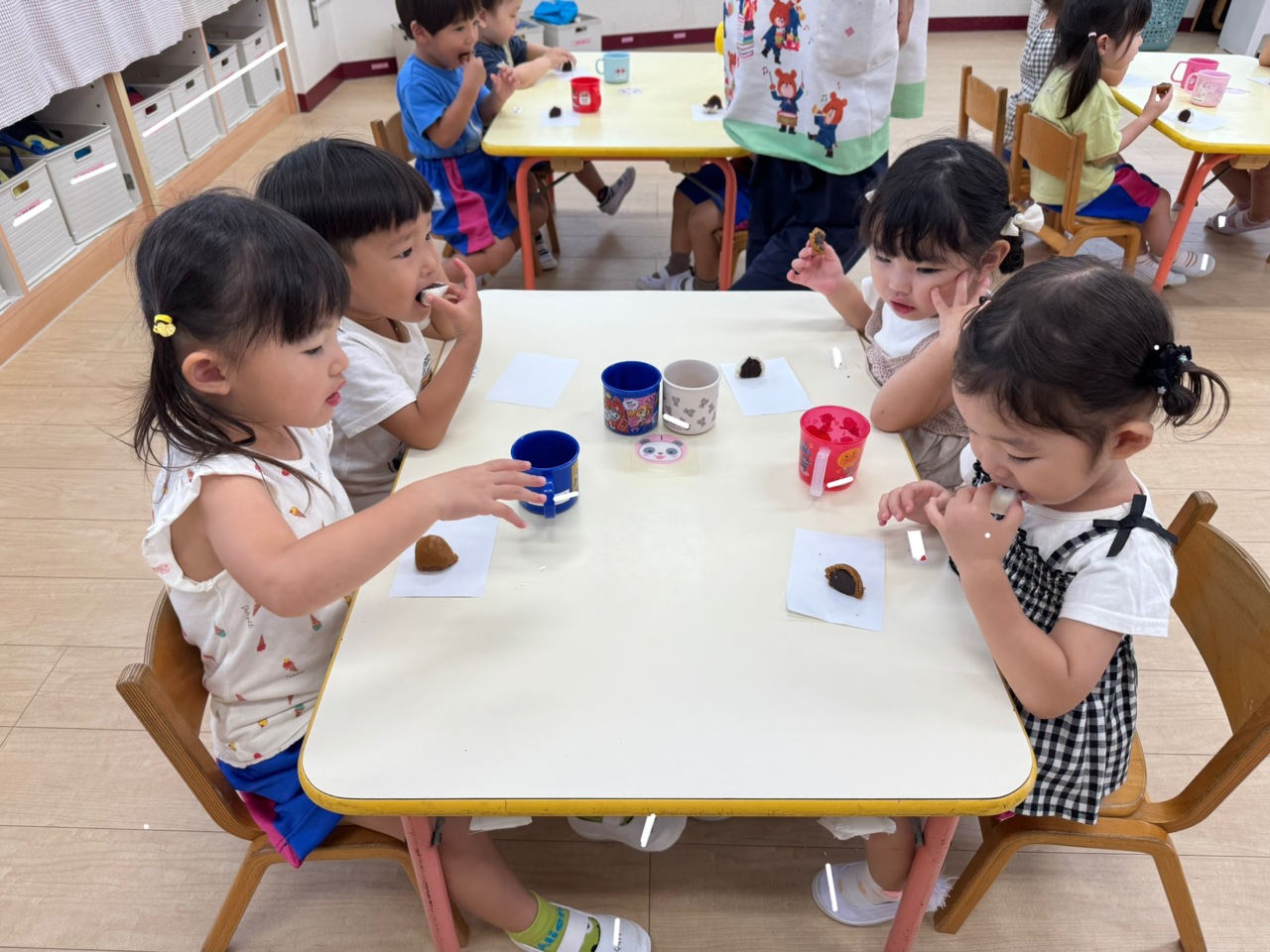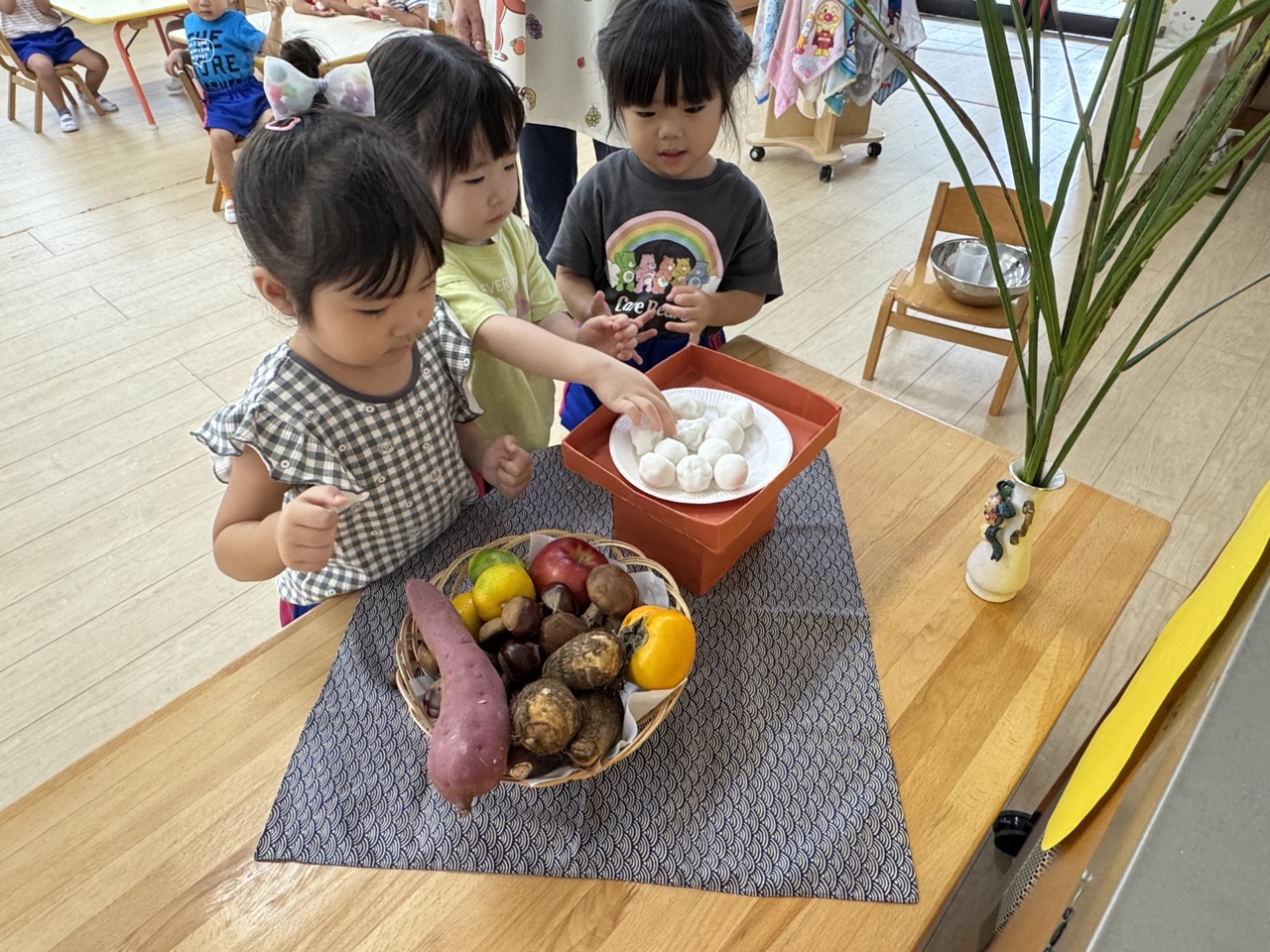 にじ組さんは、おまんじゅうをいただきました♪ 二色の味を、ゆっくりと味わう子。 ぺろっと食べてしまう子。美味しい行事を体験出来ました。