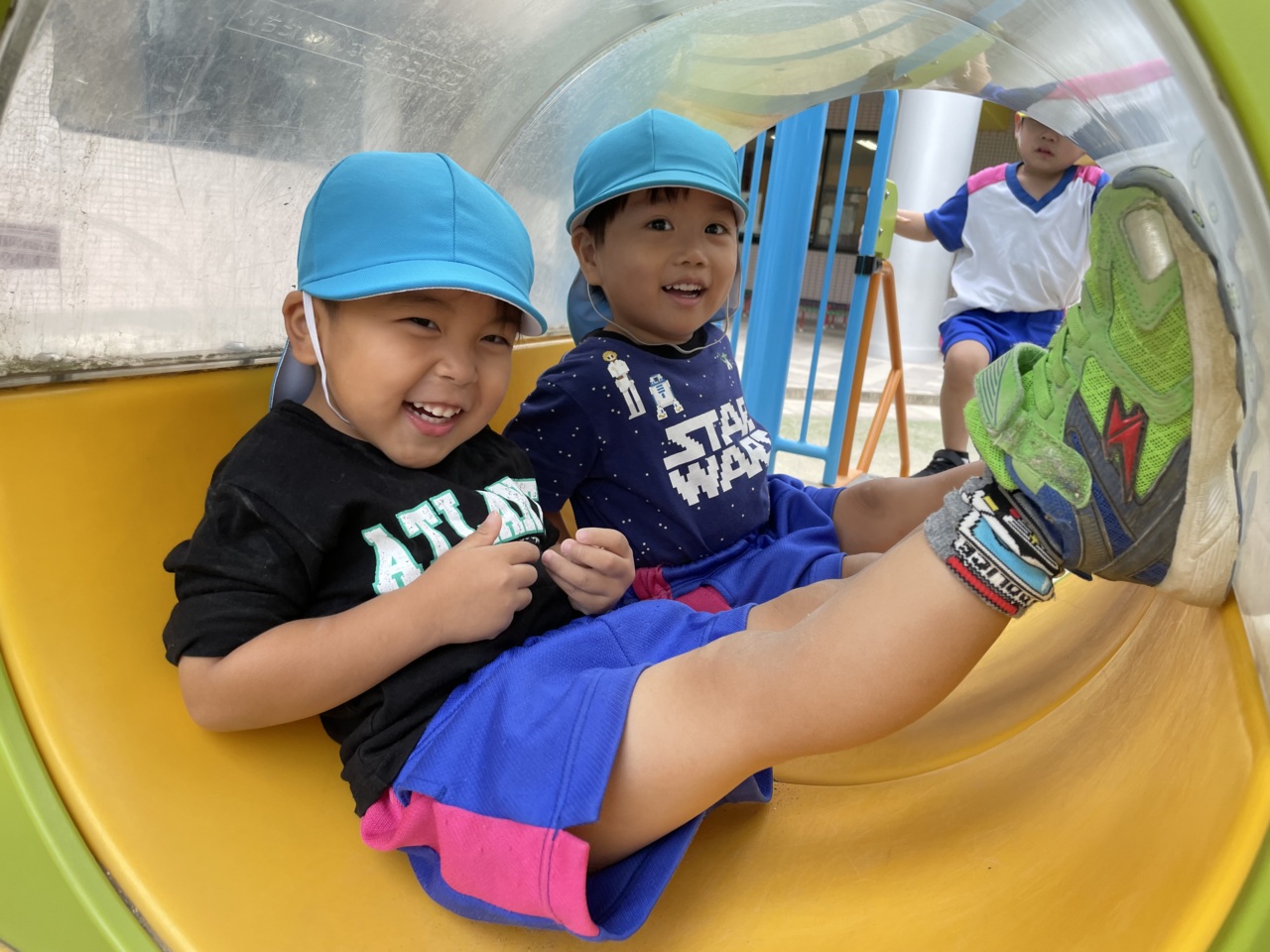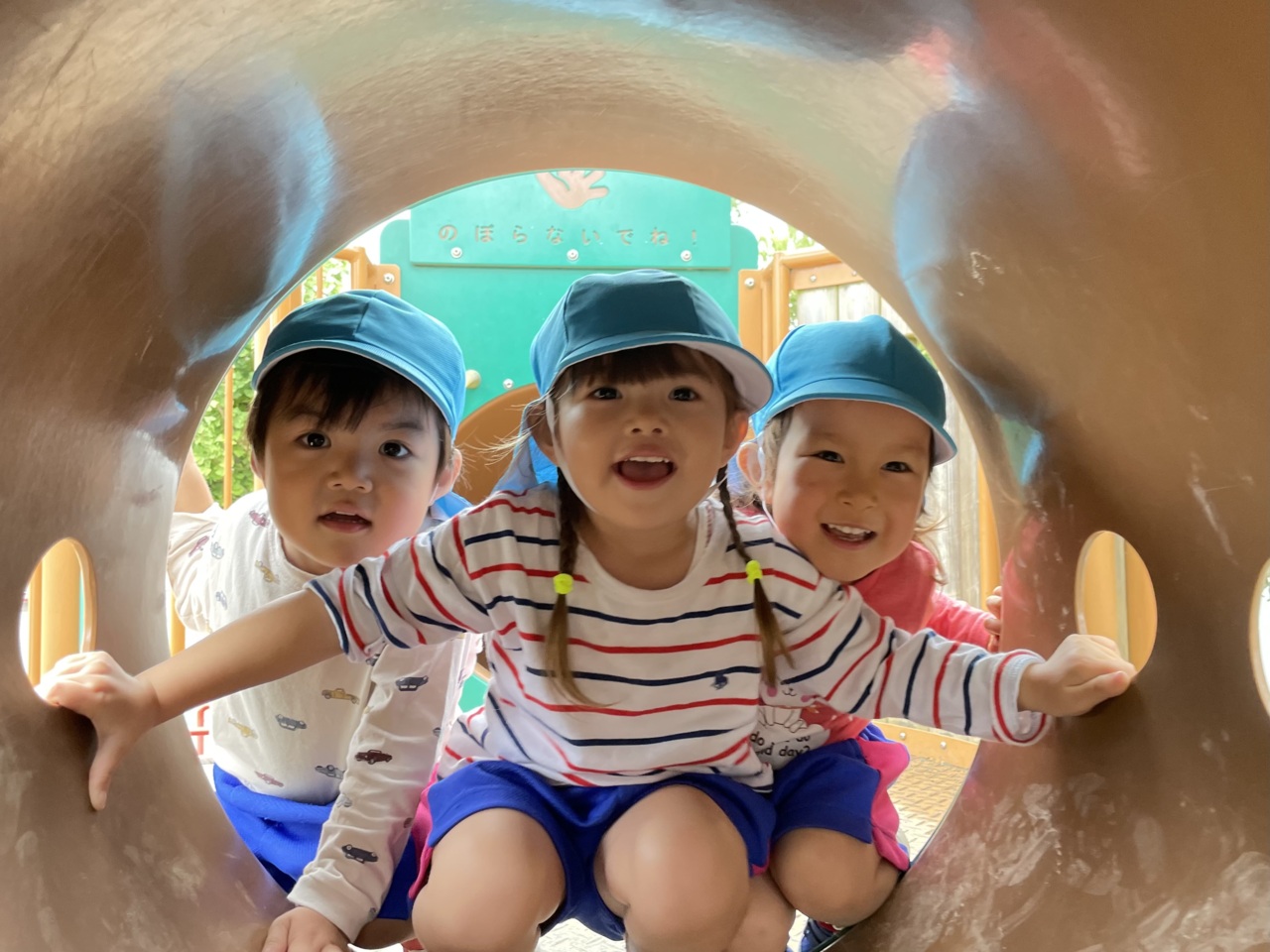トンネルの中でかくれんぼです!見つかってこの表情です(^O^)