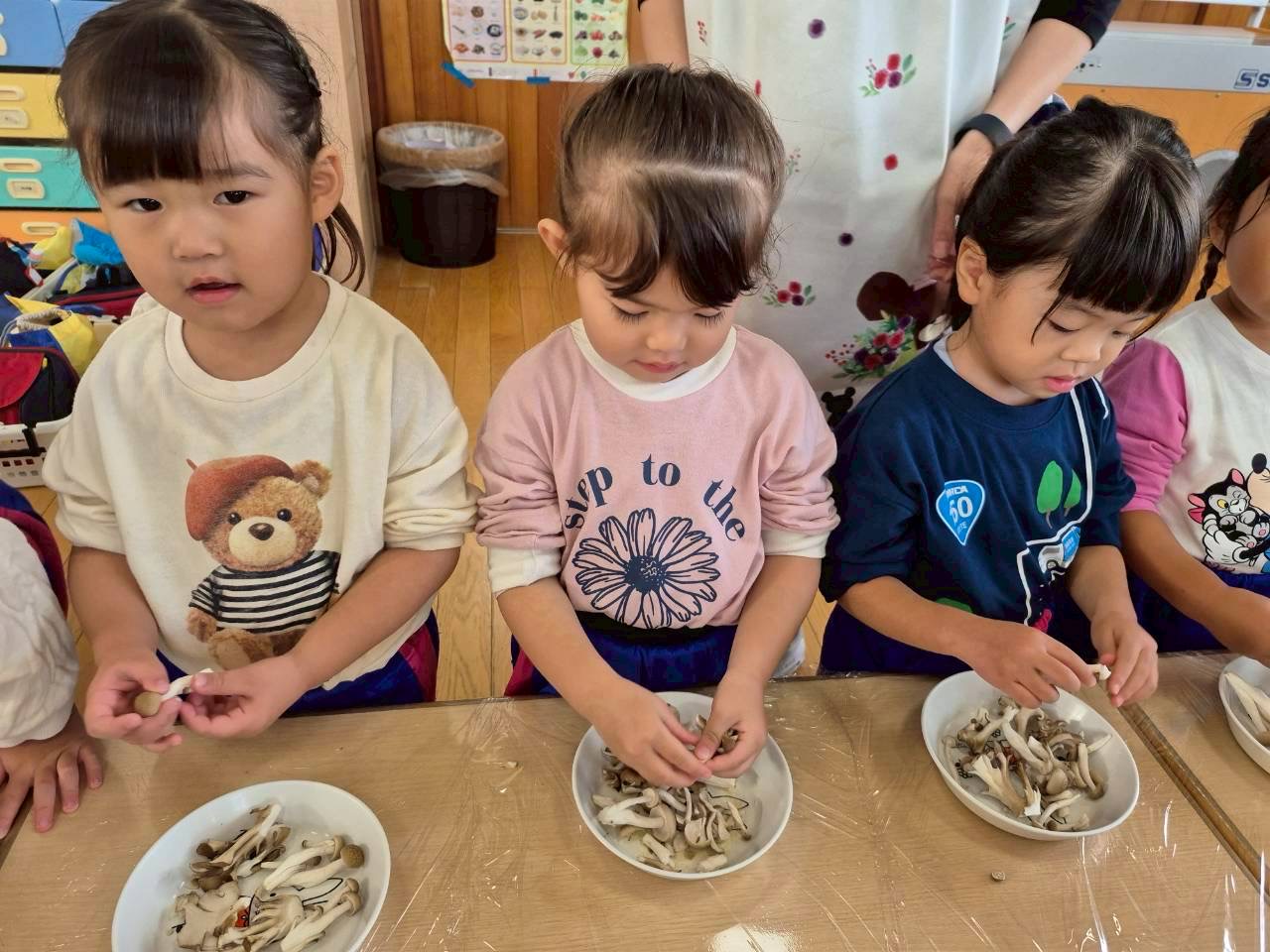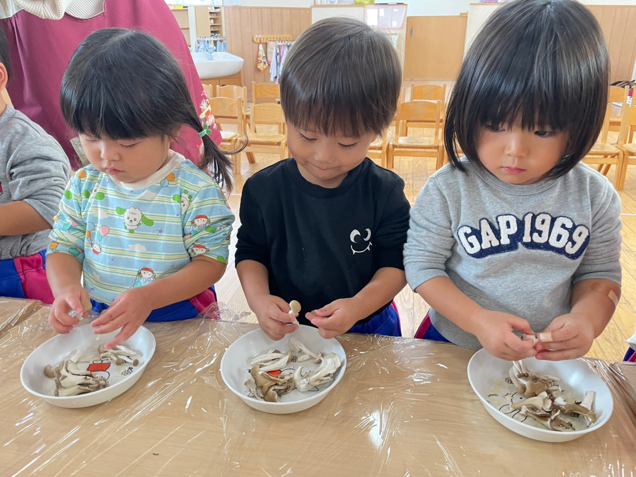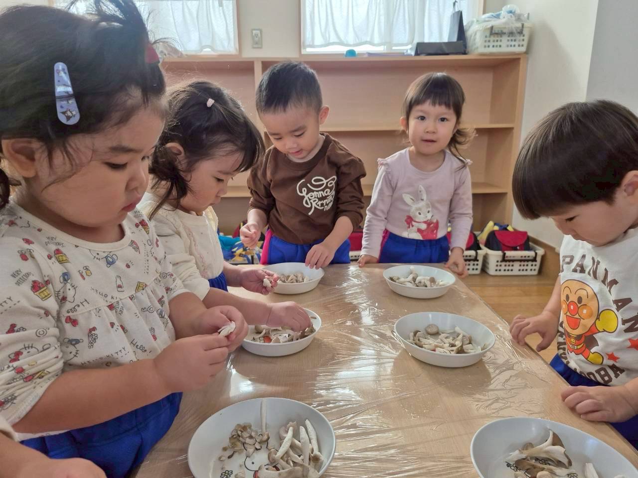 きのこをほぐすお手伝いです。 みんな張り切って行います。