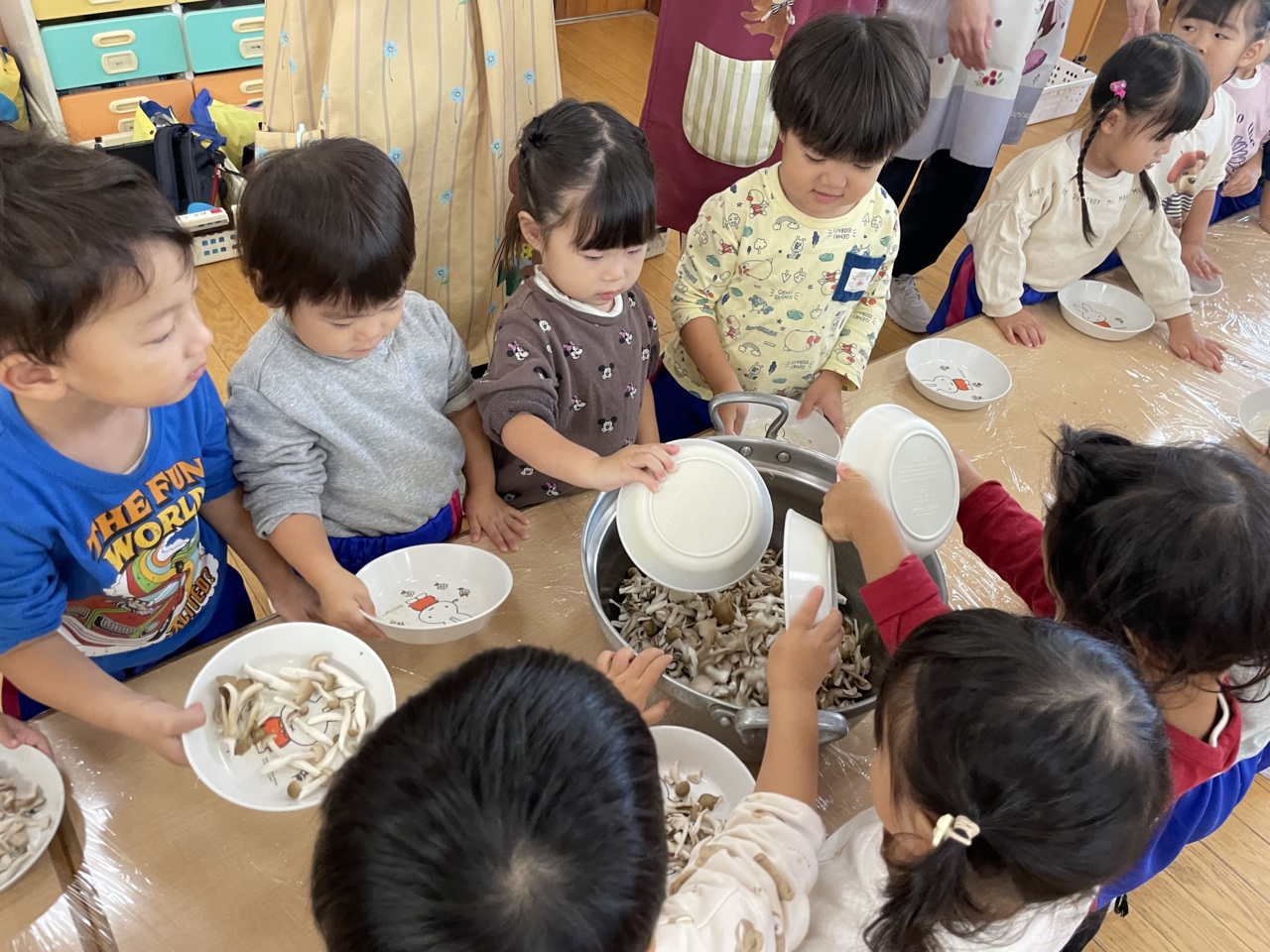 お鍋に入れて…こぼさないように… みんながほぐしてくれたきのこは、給食できのこご飯になります(*≧∀≦*)