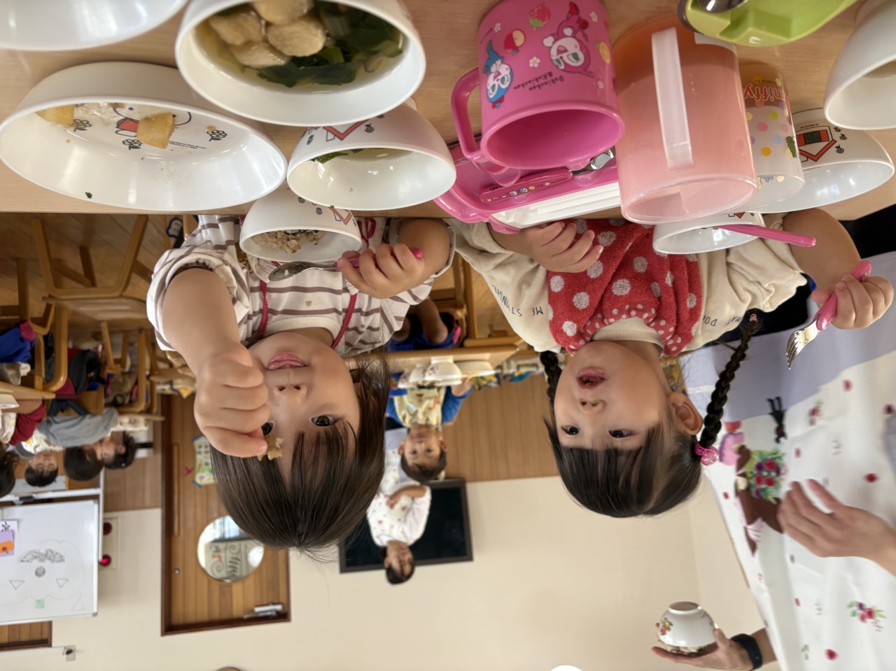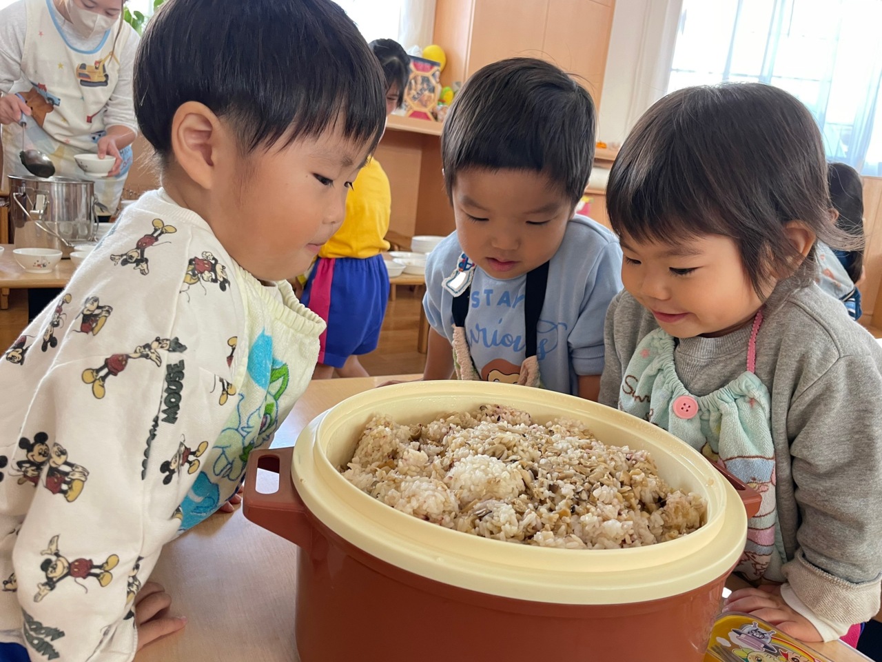 「おいしい!」 子どもたちがお手伝いしてできたご飯は、格別でした! おかわりをした子もたくさんいます!