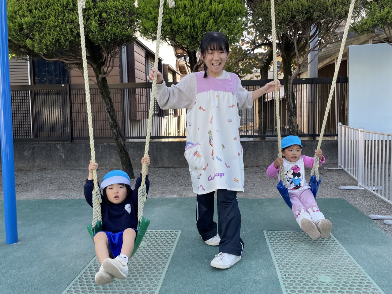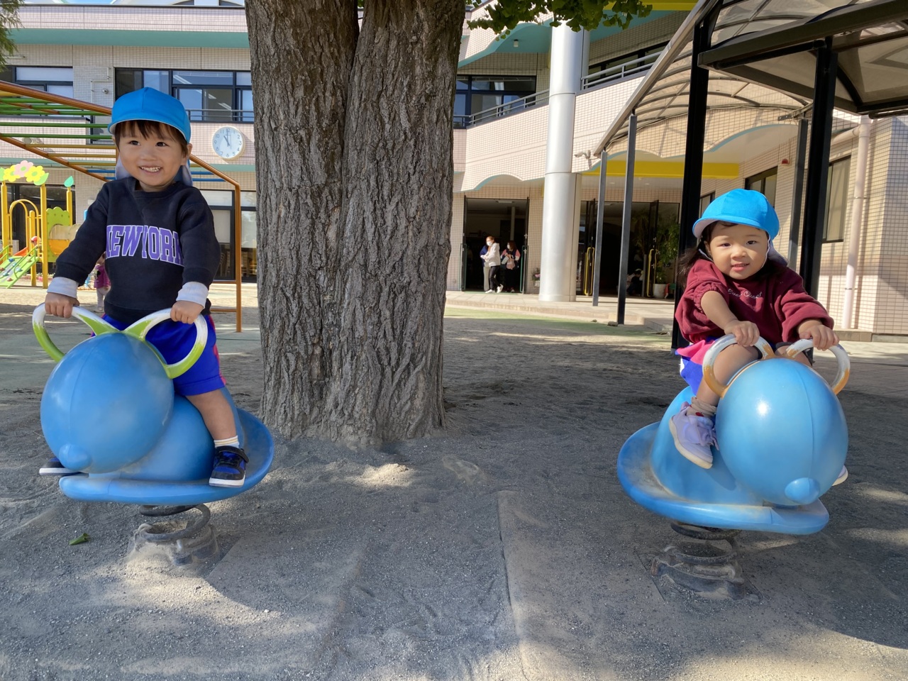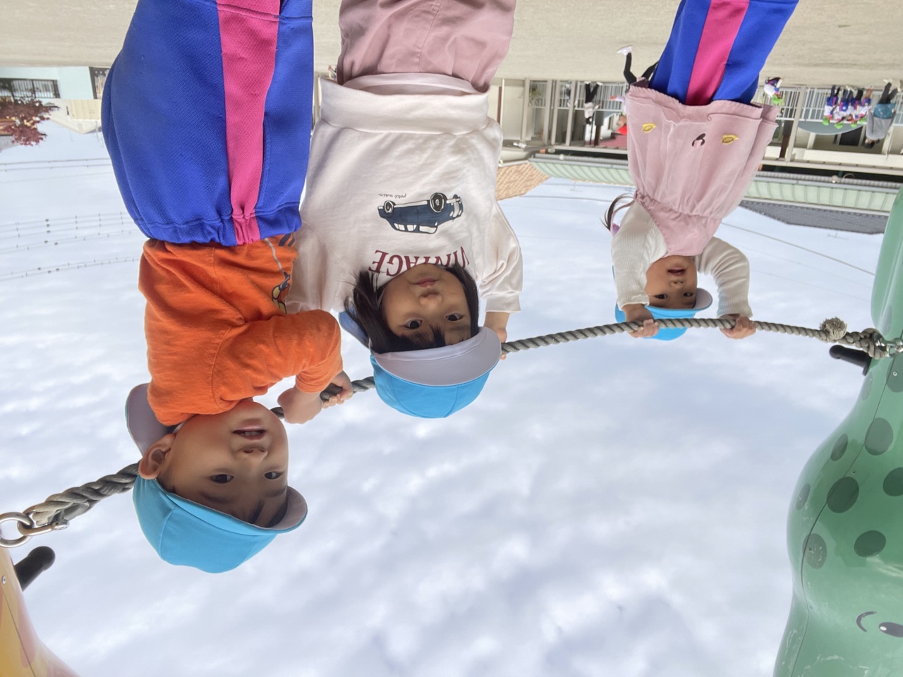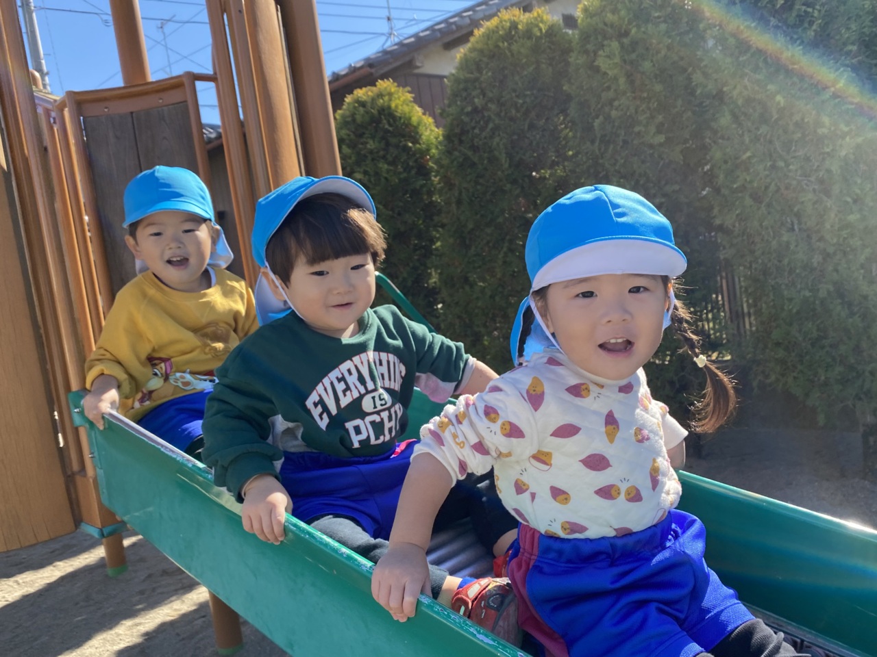 お友だちと滑る滑り台が楽しいとこの表情です!