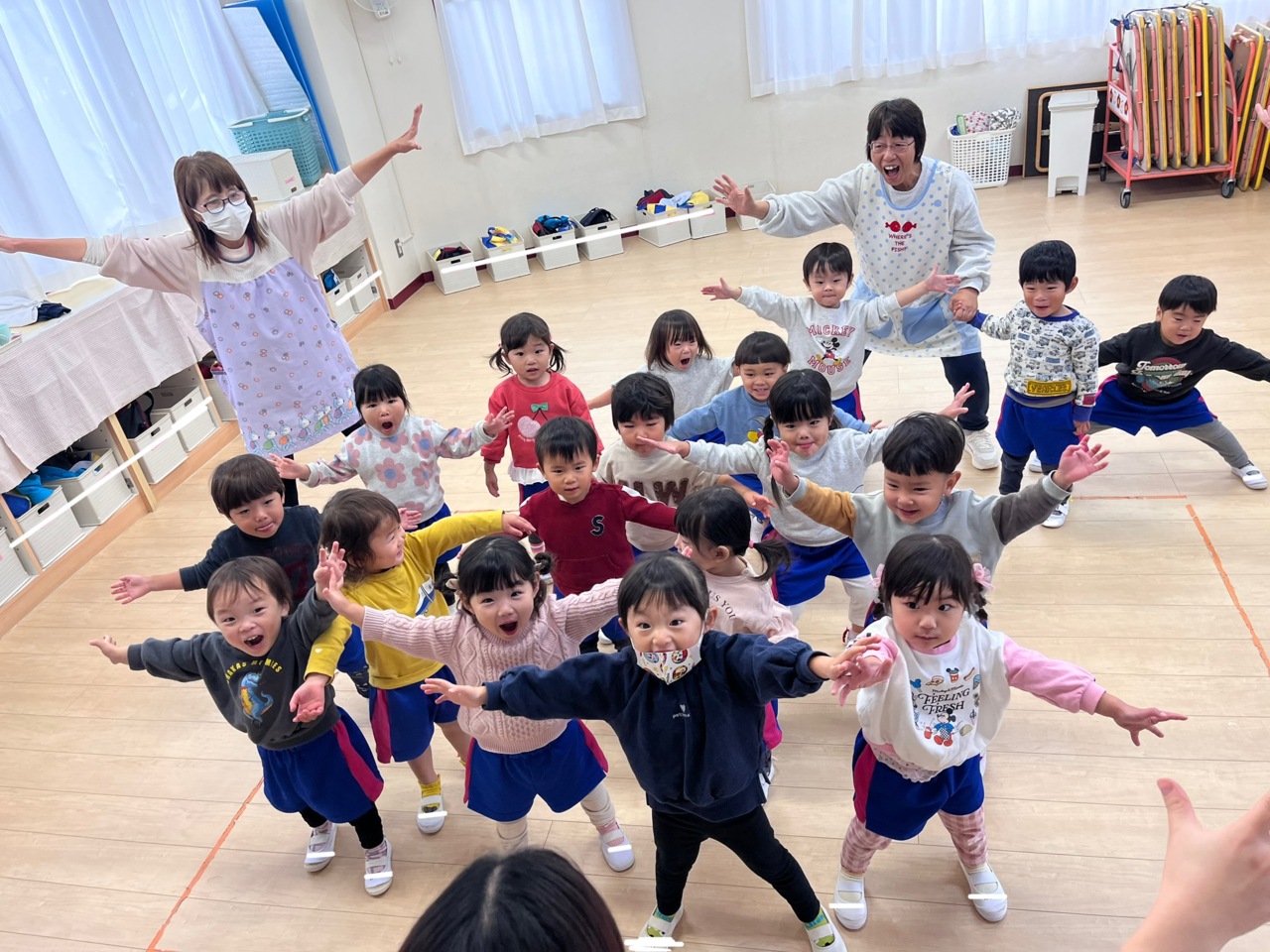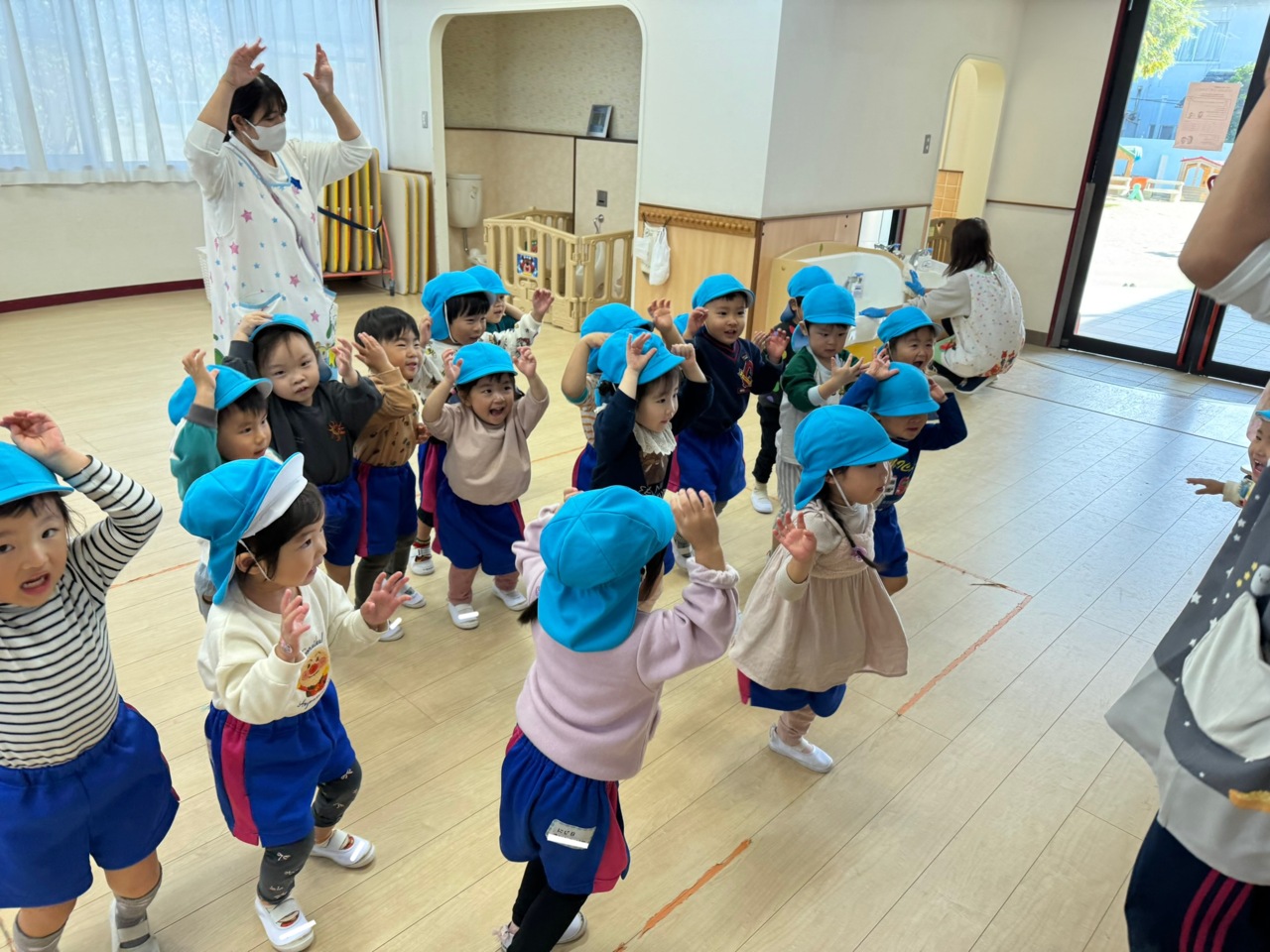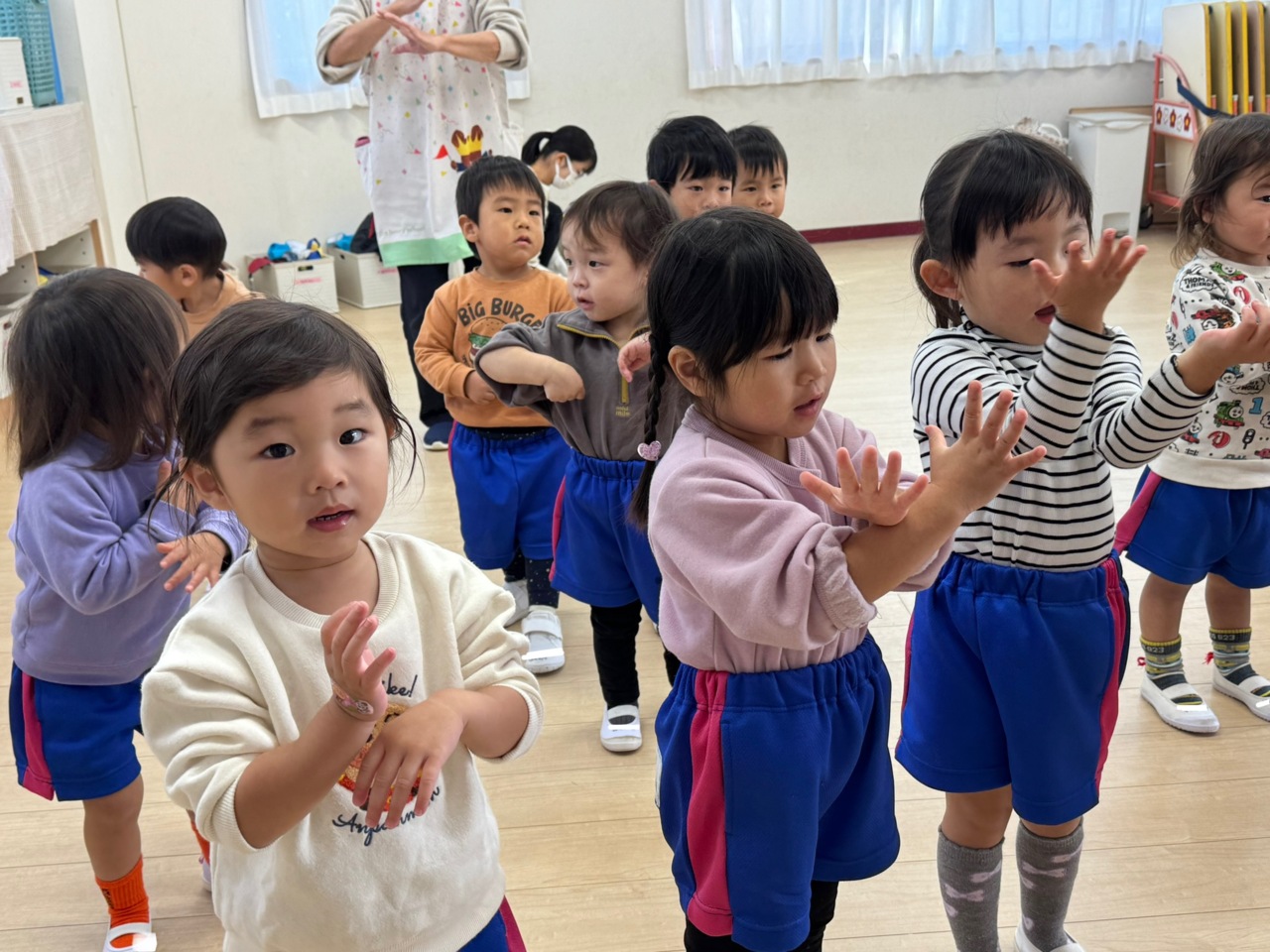 絵本「けんけんぱっ」を見た後、みんなで「ぱっ!」