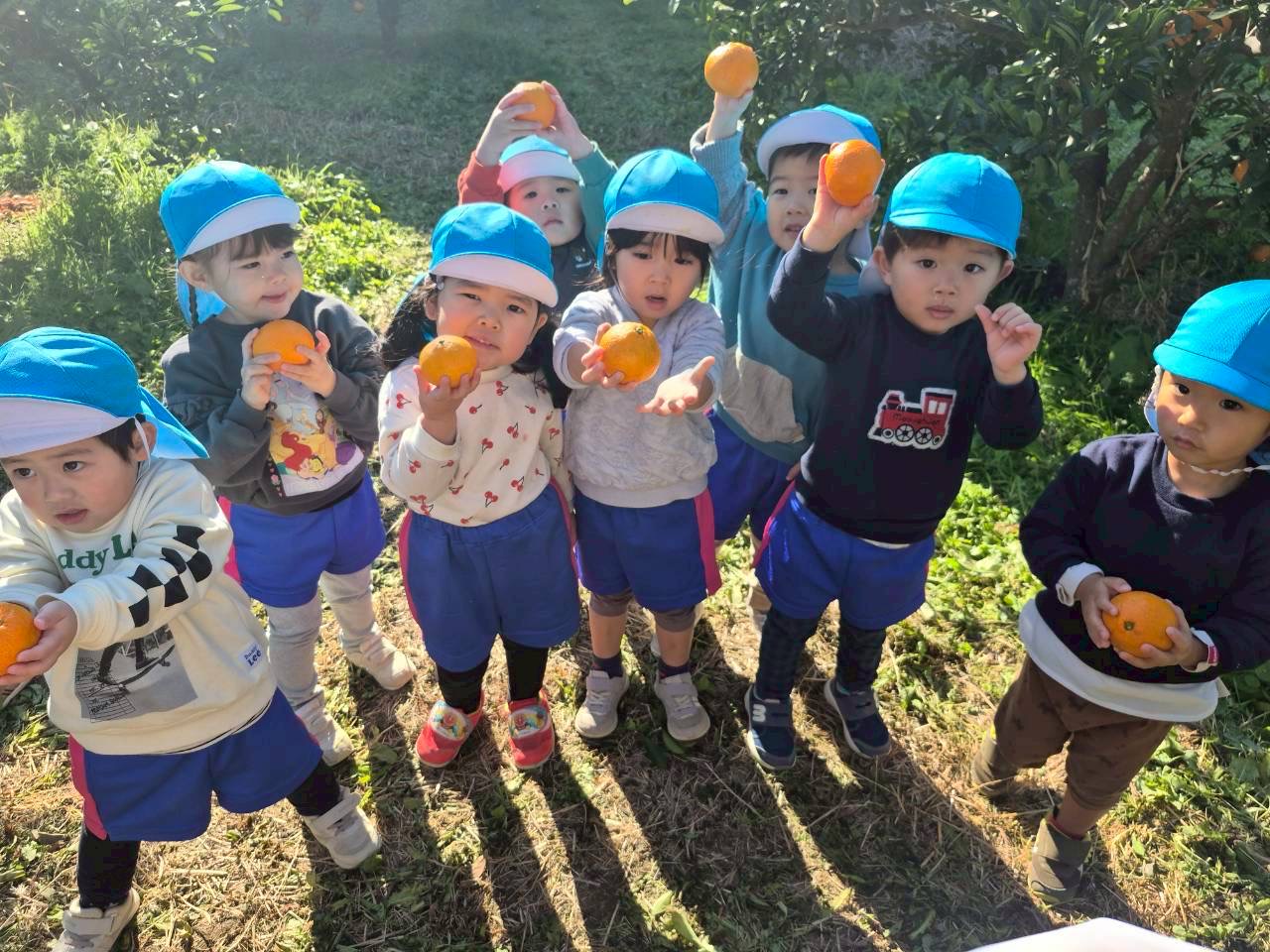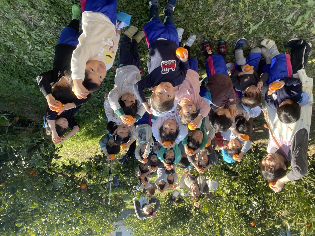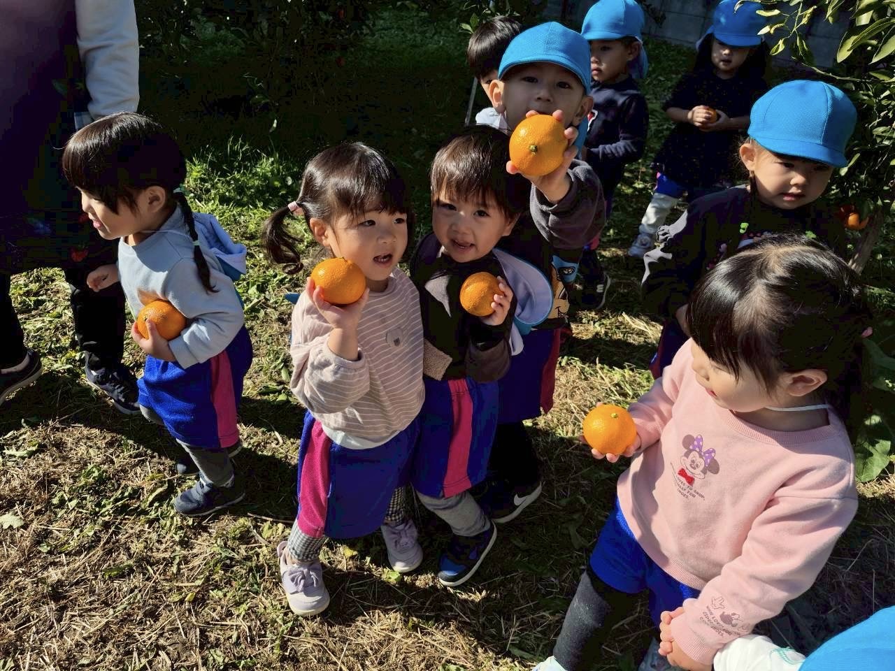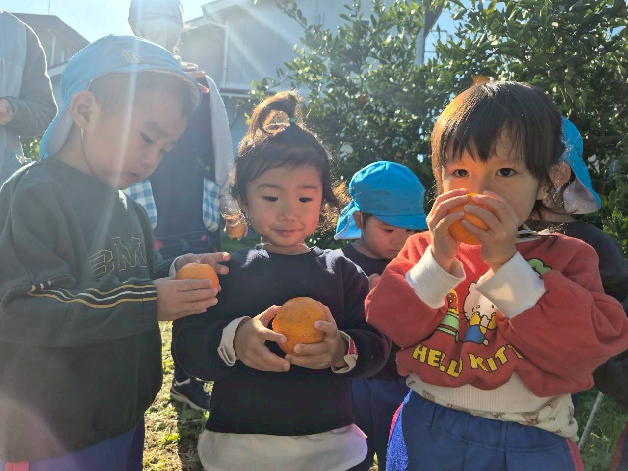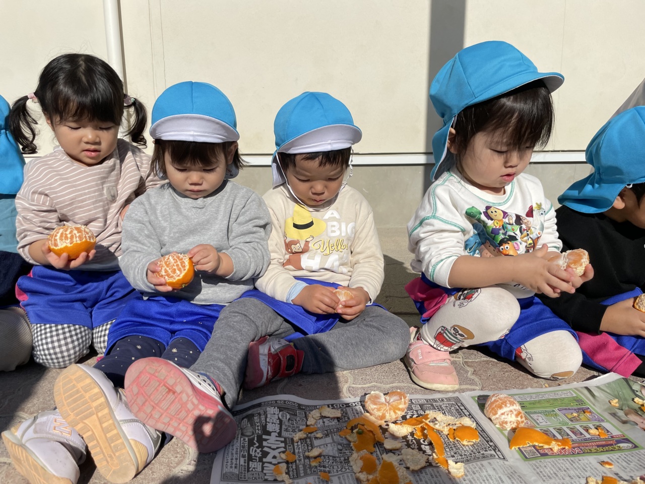 みかん狩りの日、外はポカポカだったので、みんなで外で並んで食べました。