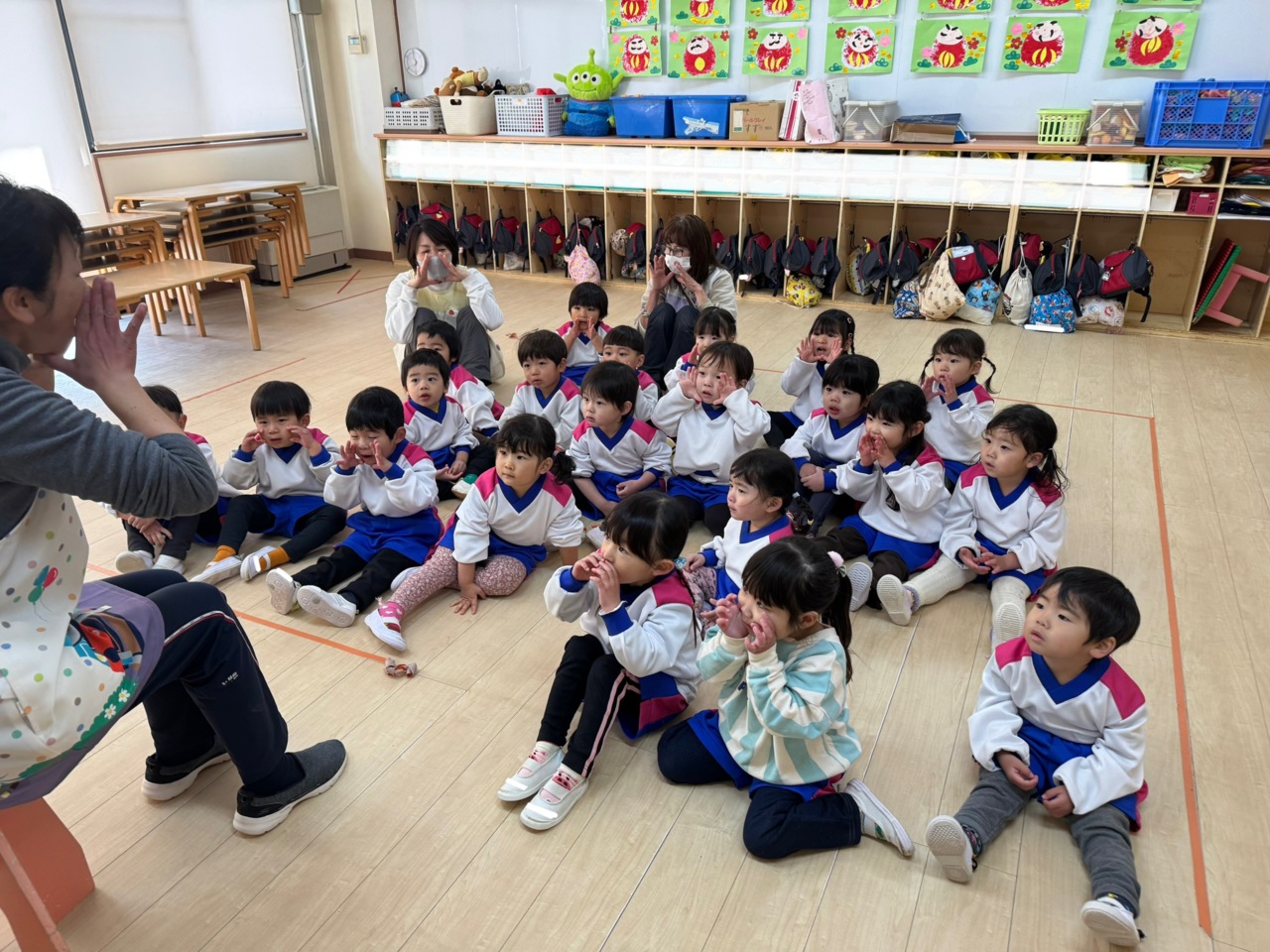 園庭は突風が吹き荒れ、お部屋に戻りました。