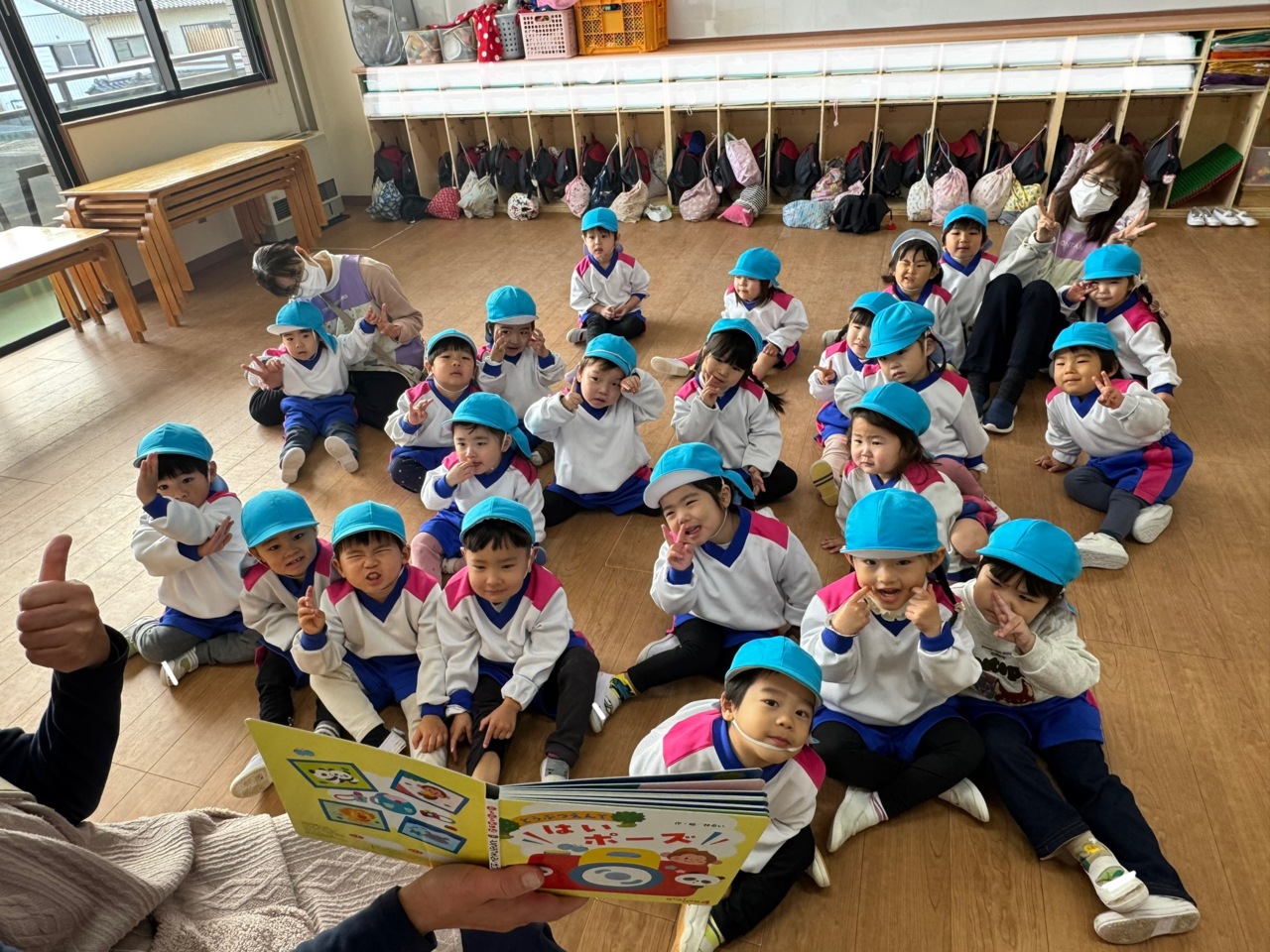 絵本を見て「はい、ポーズ!」
