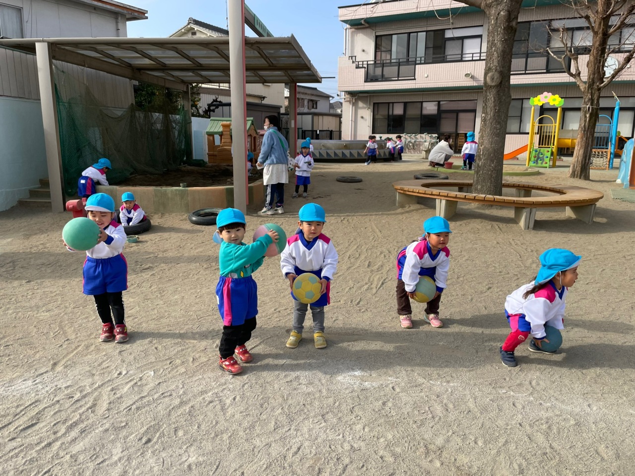 にじさんは、ボール遊びが得意です! みんなで「えいっ!!」と遠くまでボールを飛ばします!