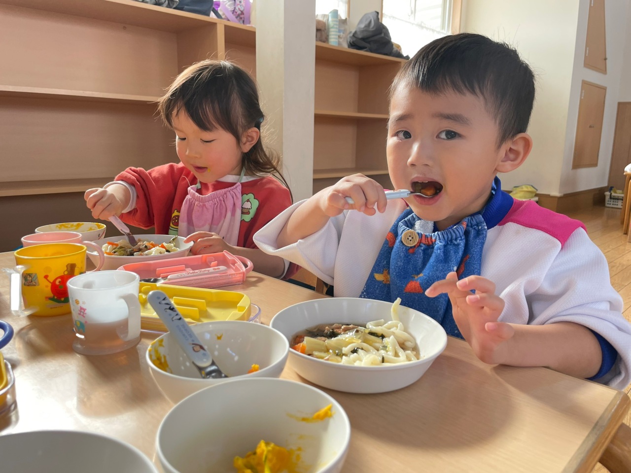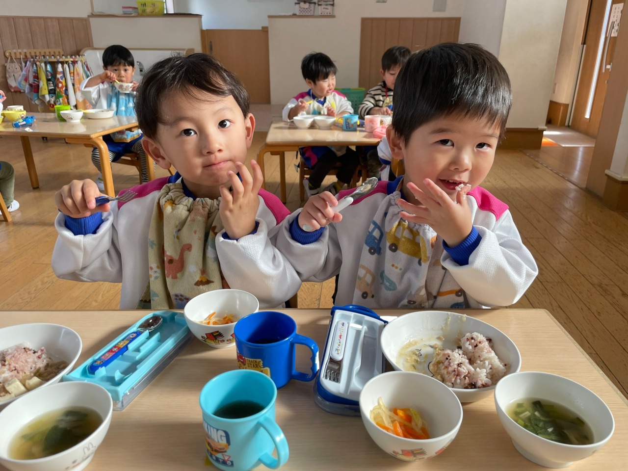 給食の時間、モリモリ食べるにじさんです。