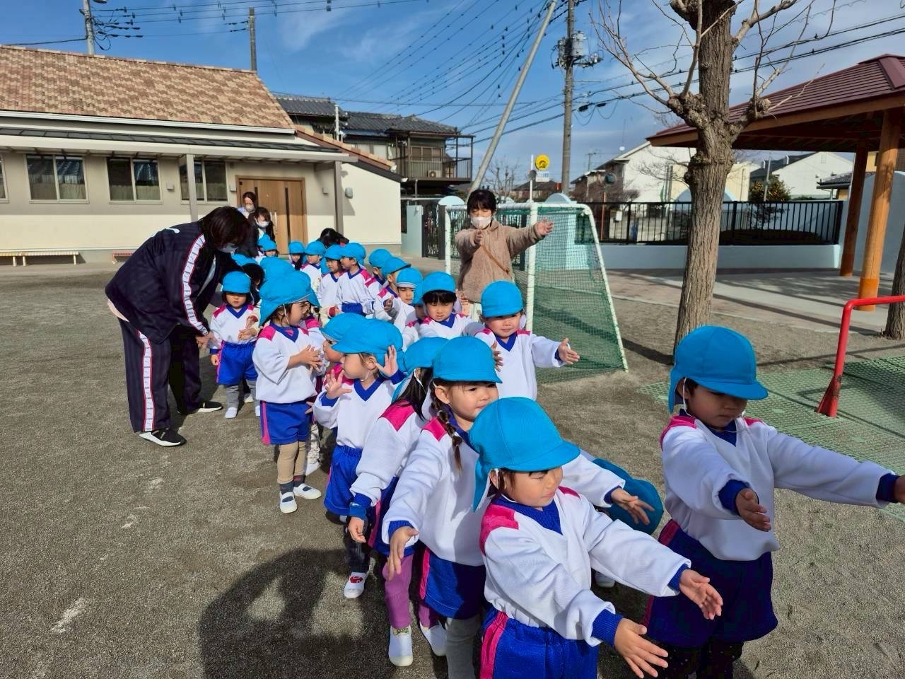 火災を想定した避難訓練がありました。 園庭に逃げ、並んでいるところです。