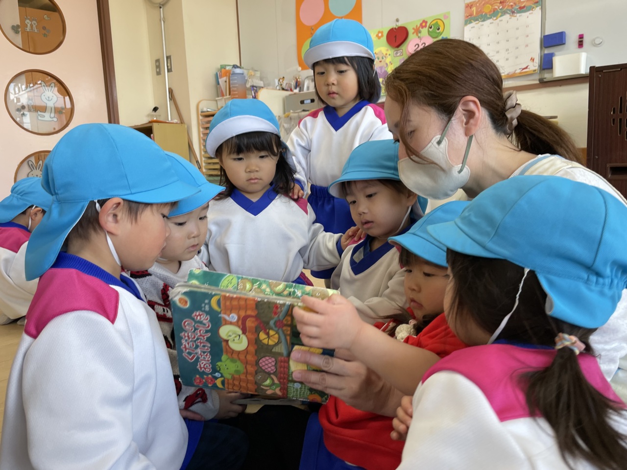 楽しい絵本は、みんなで一緒に見ます。 絵本が大好きな子どもたちです。
