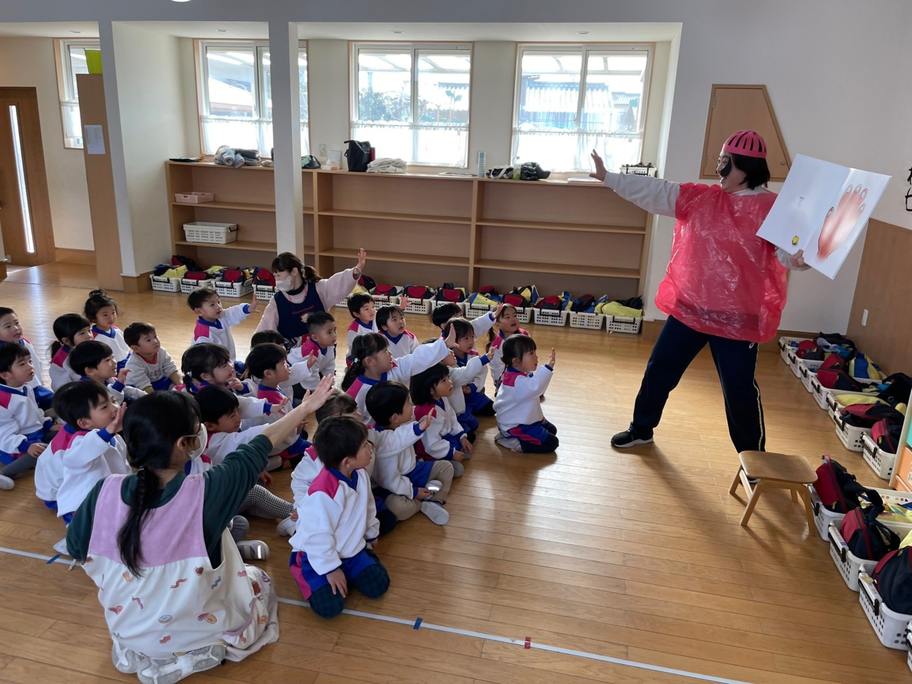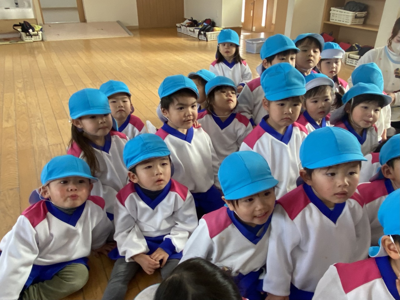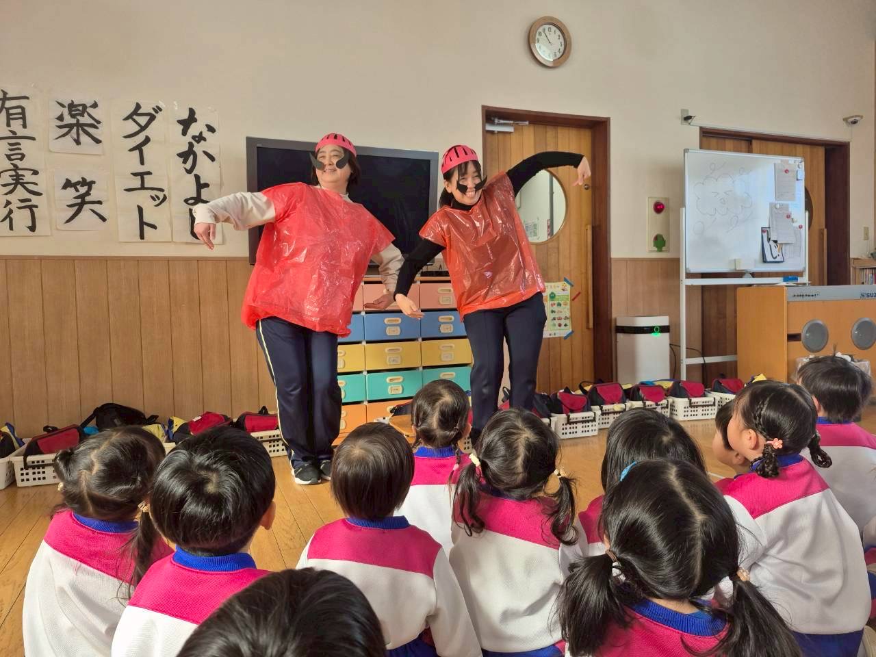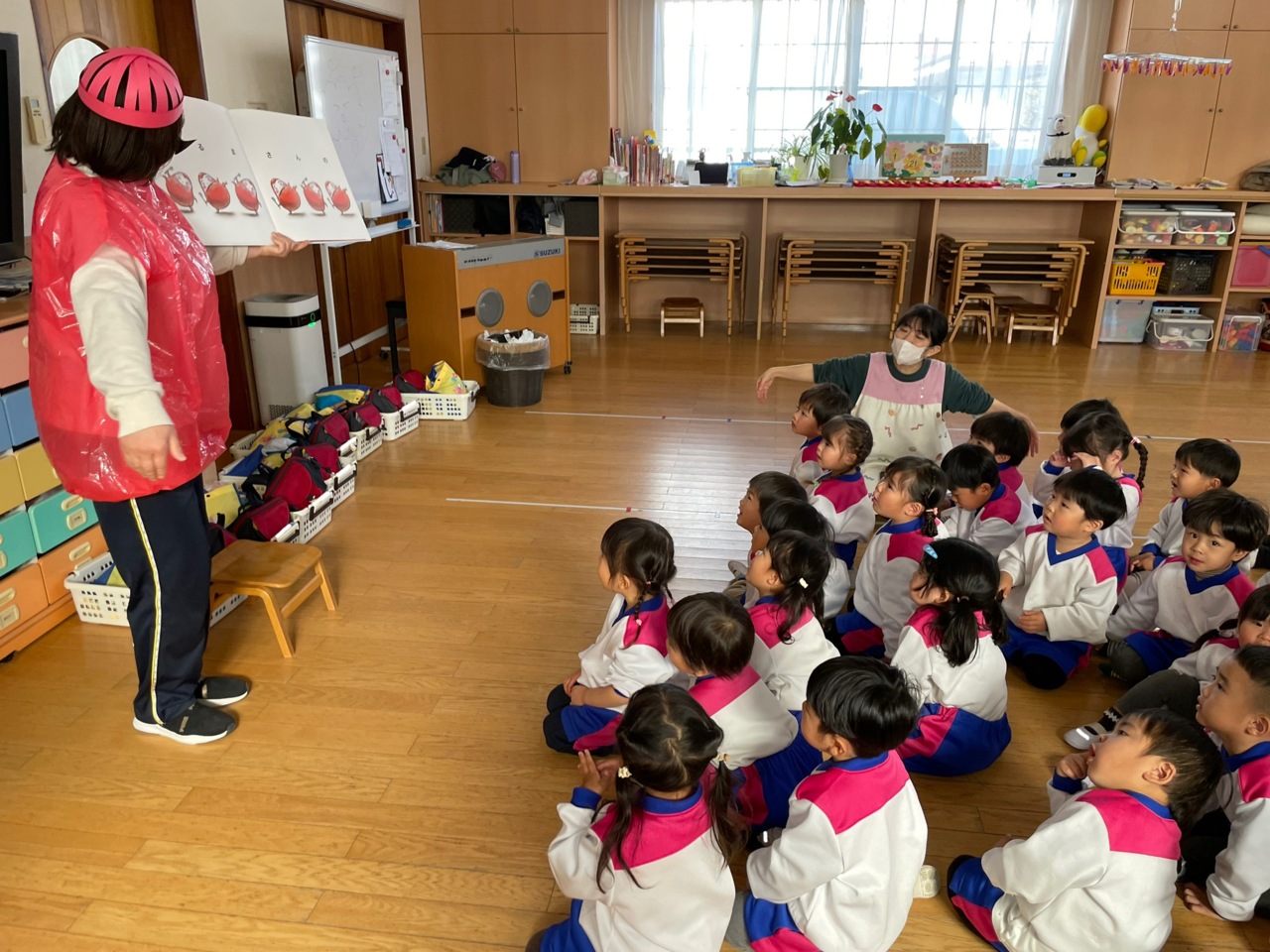 「だるまさんの」の絵本を、だるまさんになった先生が読んでくれて、みんなで見ました!